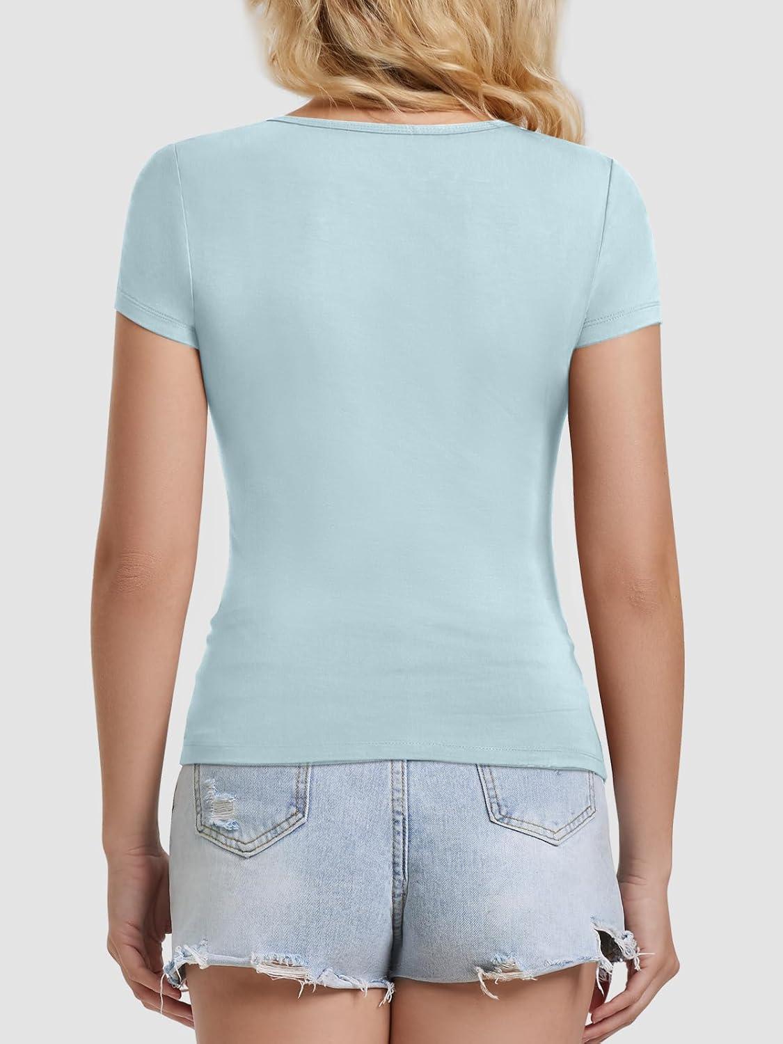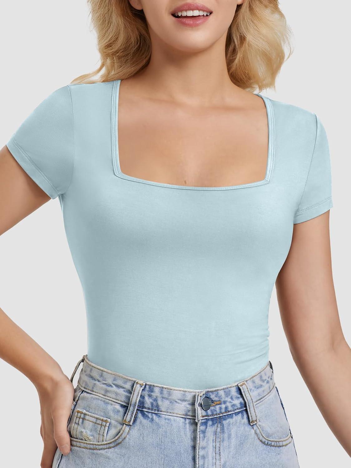 ATHMILE Modal Short Sleeve Shirts for Women 2025 Fashion Square Neck Basics Slim Fitted Tops(Skyblue)