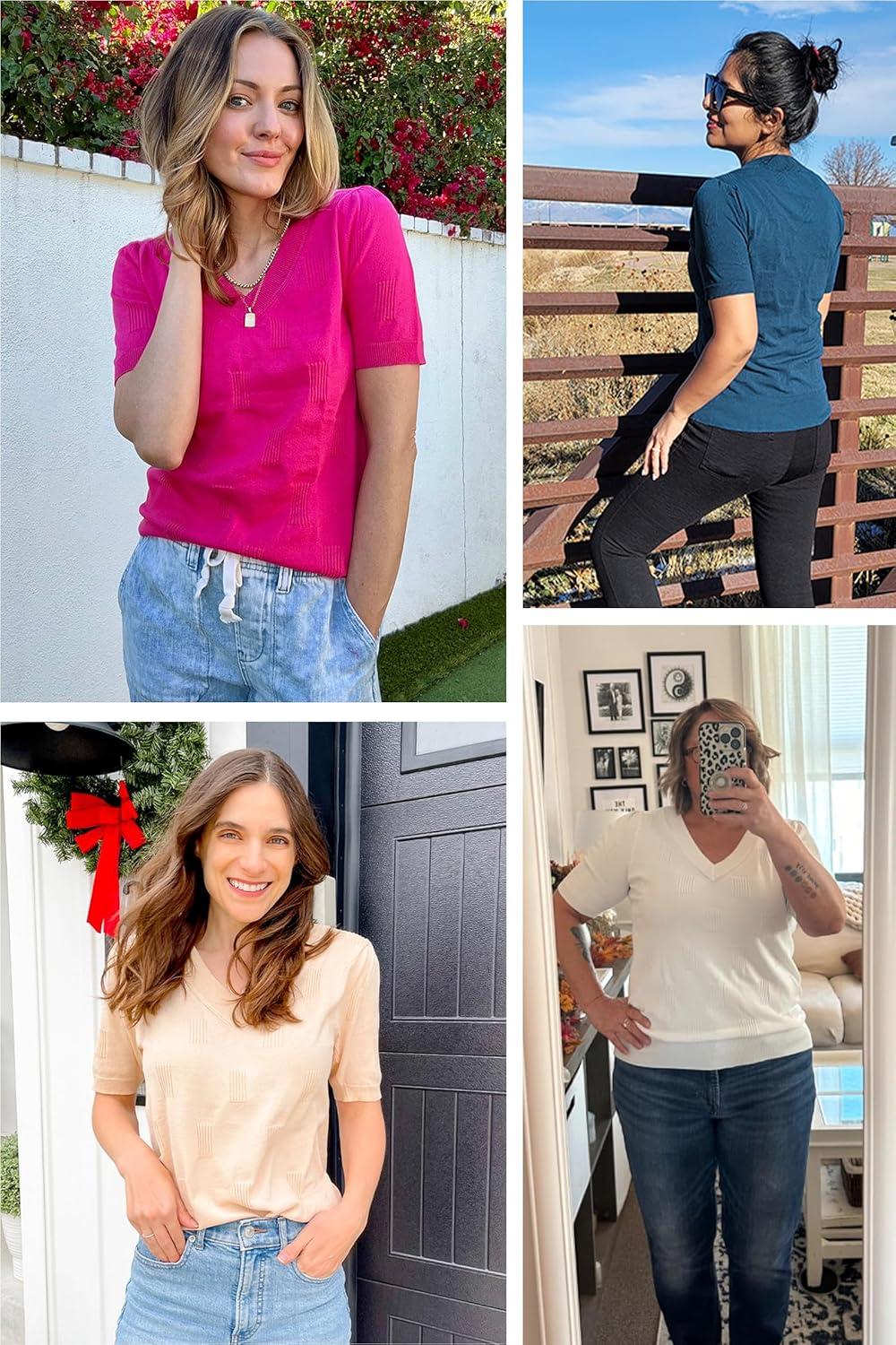 ATHMILE Short Sleeve V Neck Sweaters Dressy Casual Blouses Lightweight Thin Knit Fashion Shirts Summer Tops for Women(White)