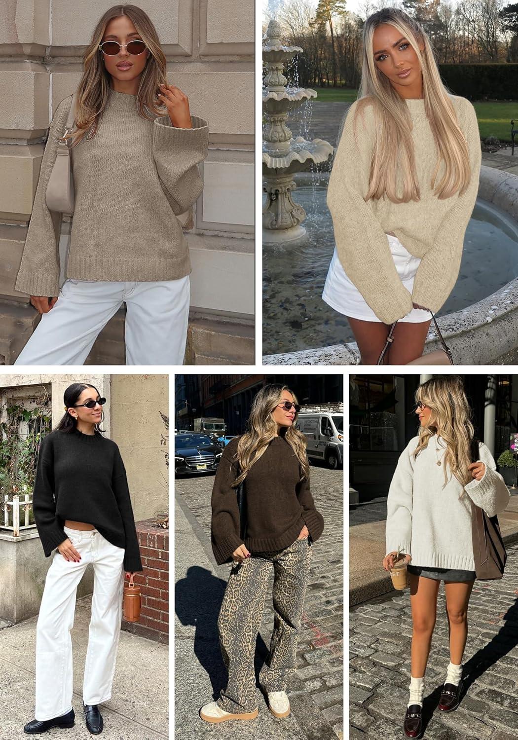 ATHMILE Sweaters for Women 2025 Fall Fashion Outfits Long Sleeve Loose Casual Crewneck Ribbed Knit Pullover Winter Clothes(Pink)