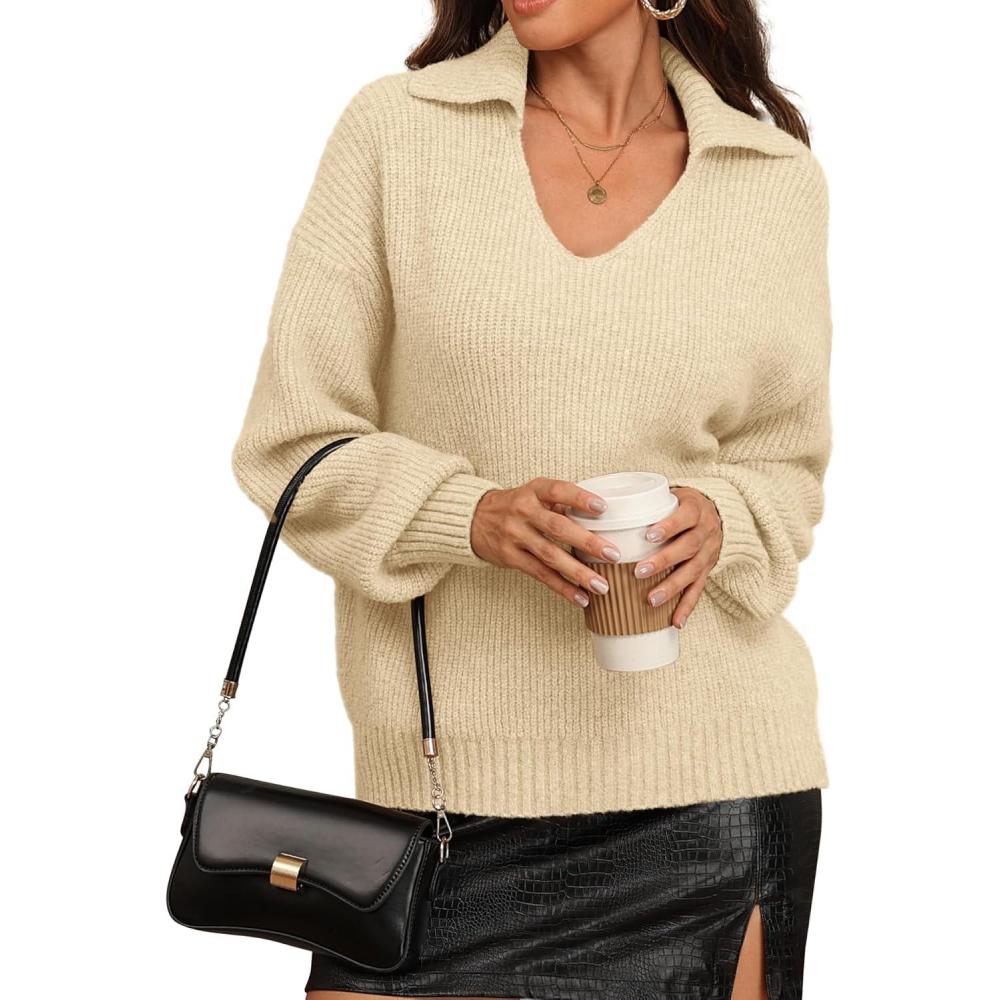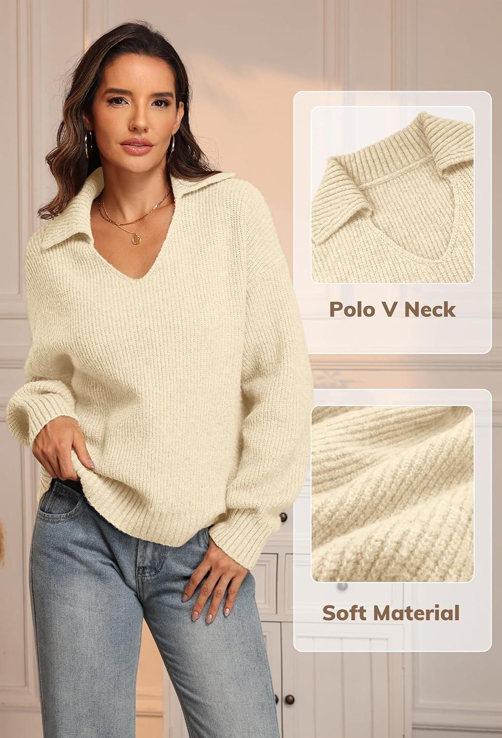 ATHMILE Sweaters for Women Fall Outfits 2025 Fashion Oversized V Neck Lapel Collar Knit Polo Shirts Pullover Sweater Tops(Apricot)