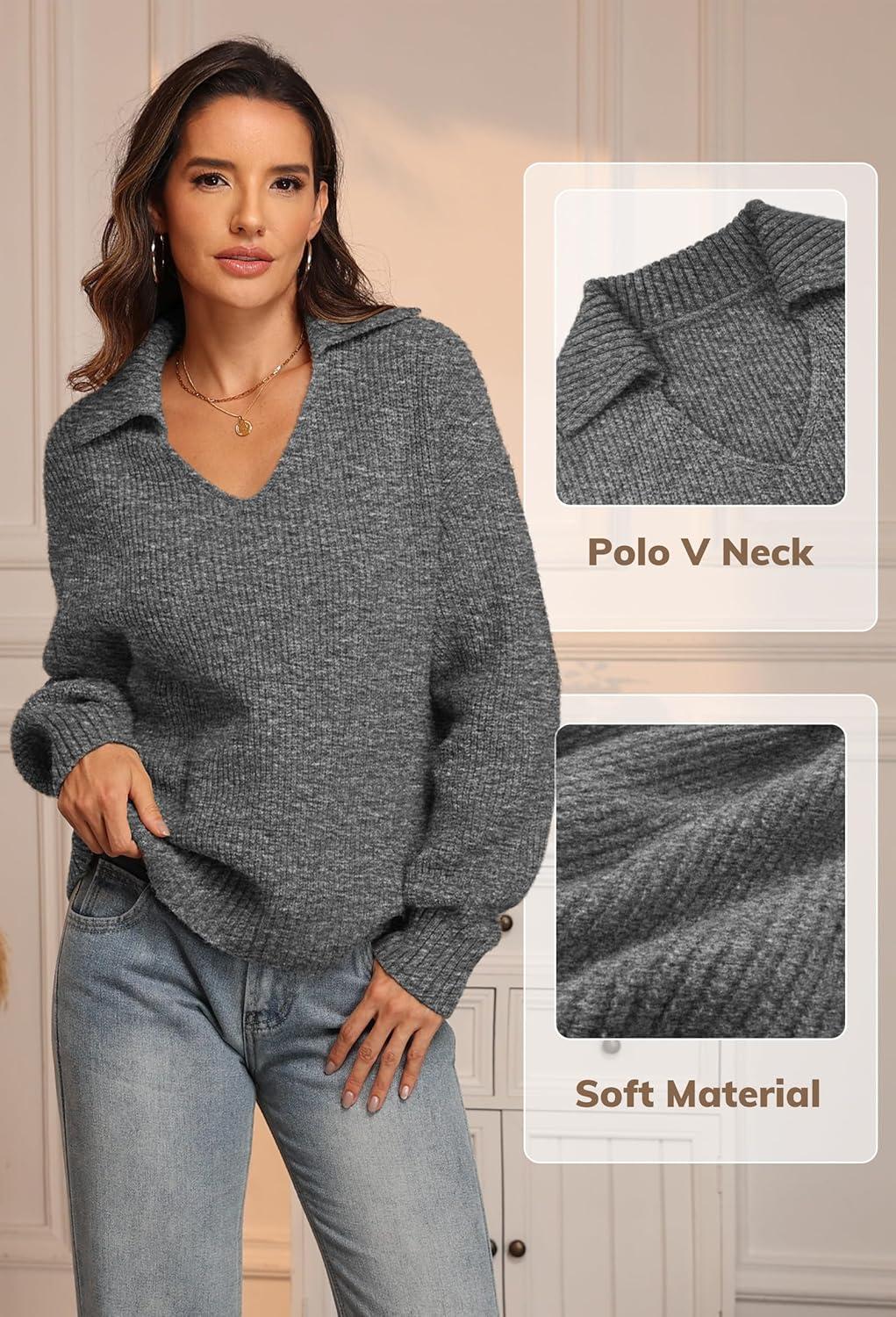 ATHMILE Sweaters for Women Fall Outfits 2025 Fashion Oversized V Neck Lapel Collar Knit Polo Shirts Pullover Sweater Tops(Grey)