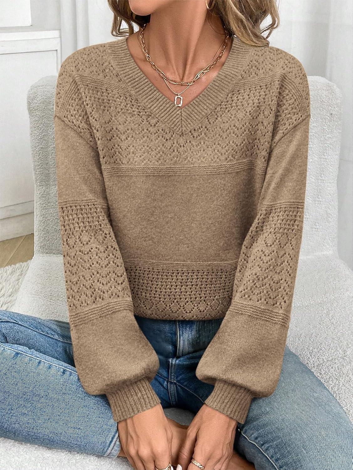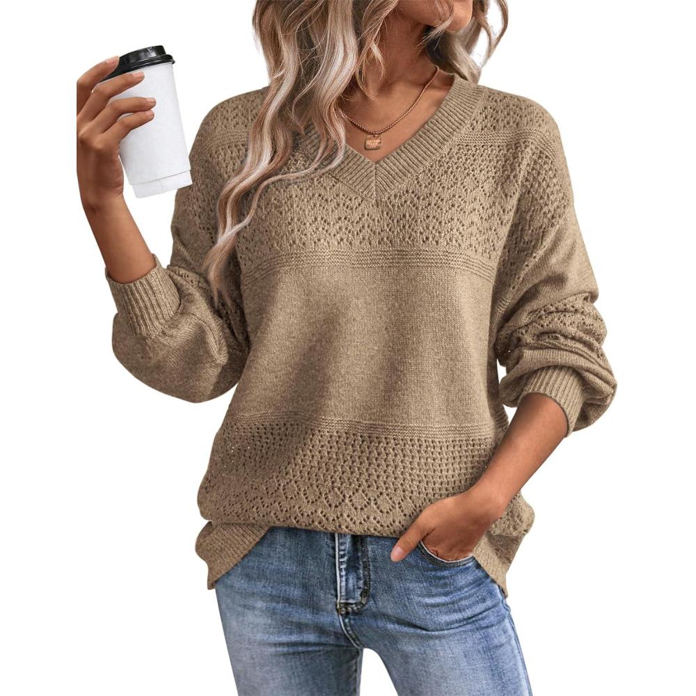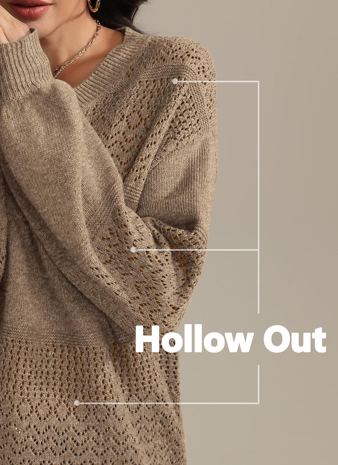 ATHMILE Sweaters for Women Fall Outfits Oversized Long Sleeve V Neck Crochet Sweaters Lightweight Knit Pullover Jumper(Brown)