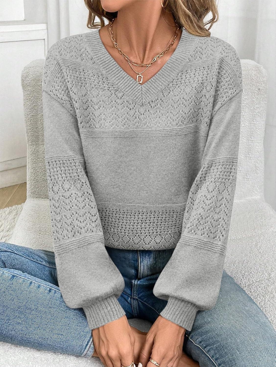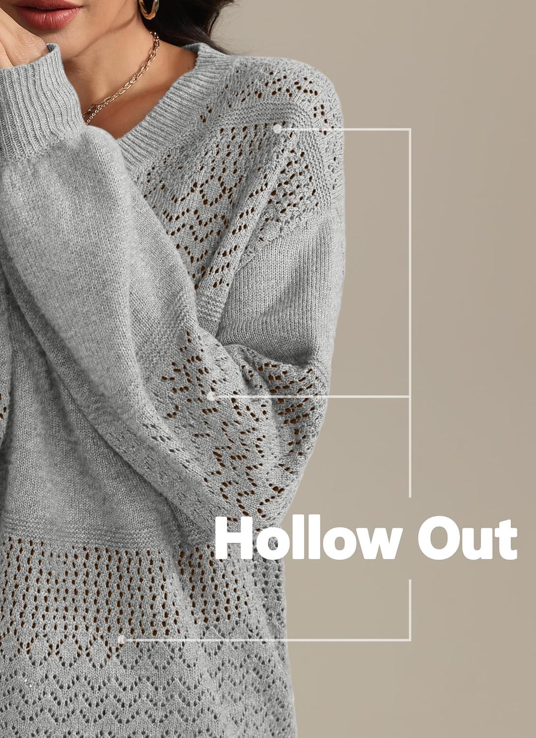 ATHMILE Sweaters for Women Fall Outfits Oversized Long Sleeve V Neck Crochet Sweaters Lightweight Knit Pullover Jumper(Grey)