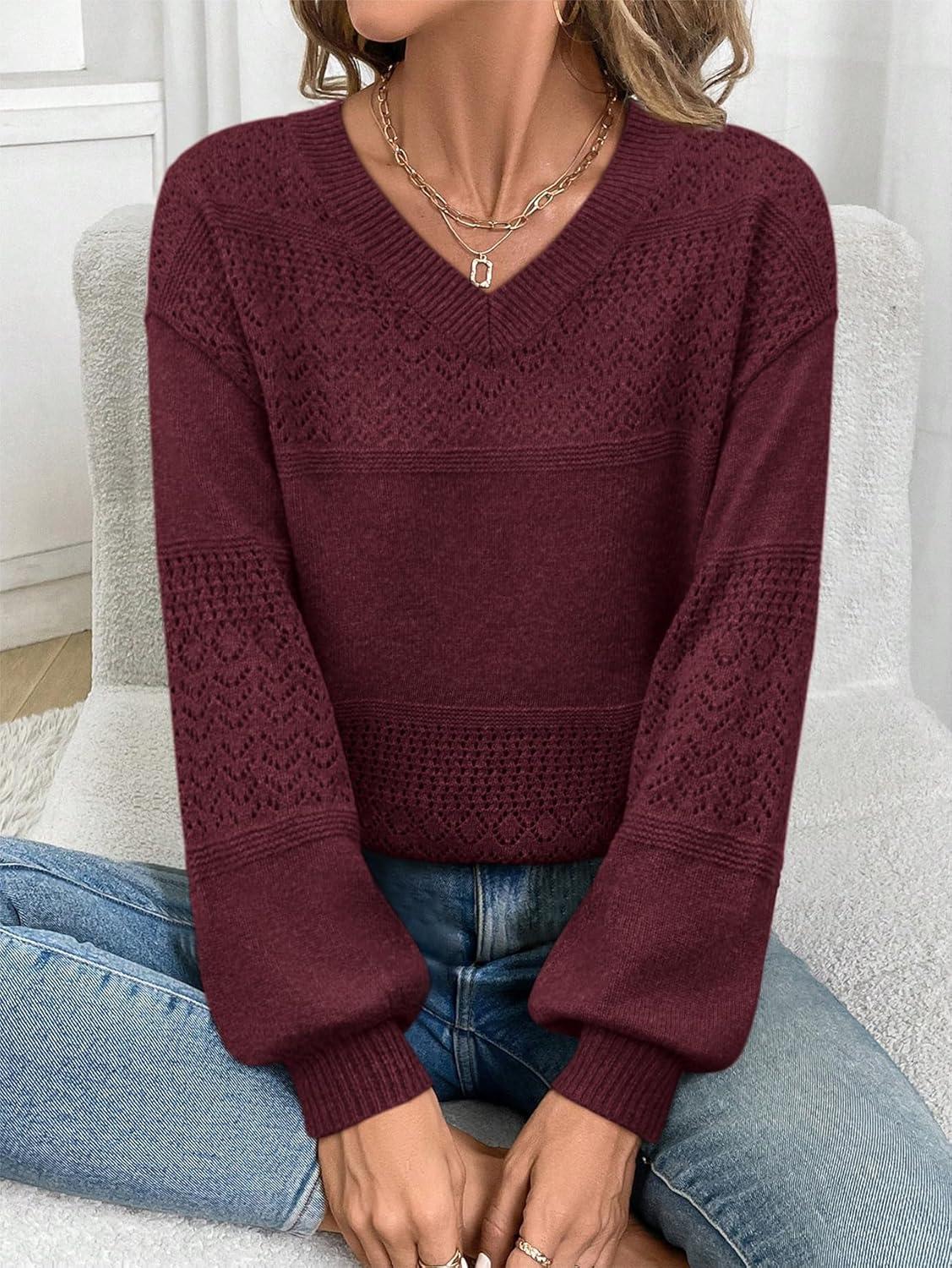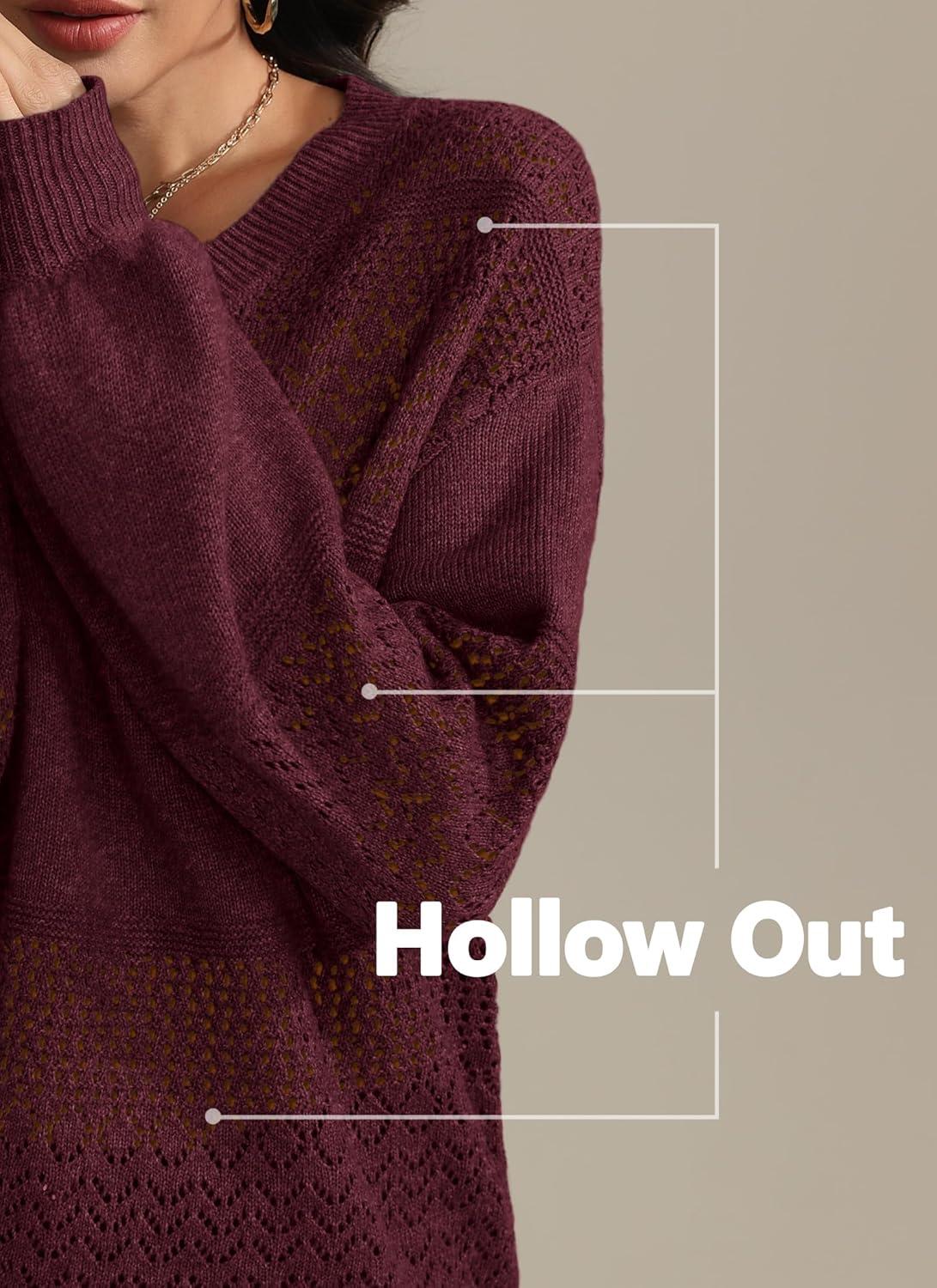 ATHMILE Sweaters for Women Fall Outfits Oversized Long Sleeve V Neck Crochet Sweaters Lightweight Knit Pullover Jumper(Wine Red)