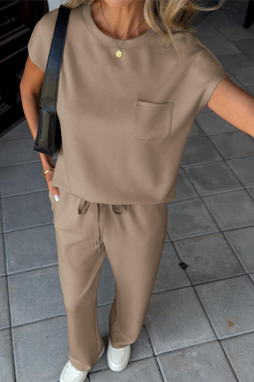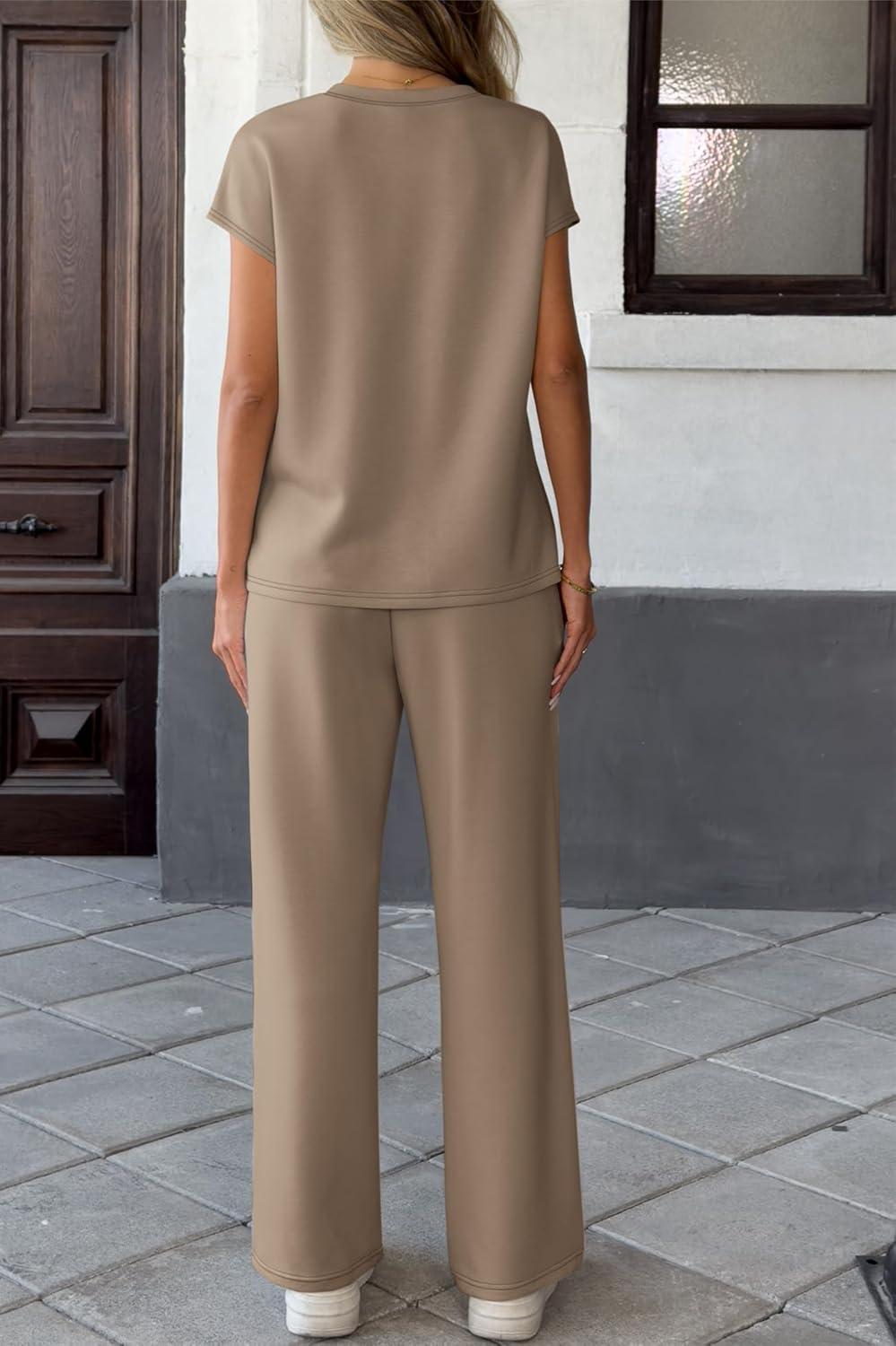 ATHMILE Two Piece Sets for Women Casual Summer Travel Outfits Cap Sleeve Vacation Cap Sleeve Wide Leg Pants Lounge Set(Coffee)