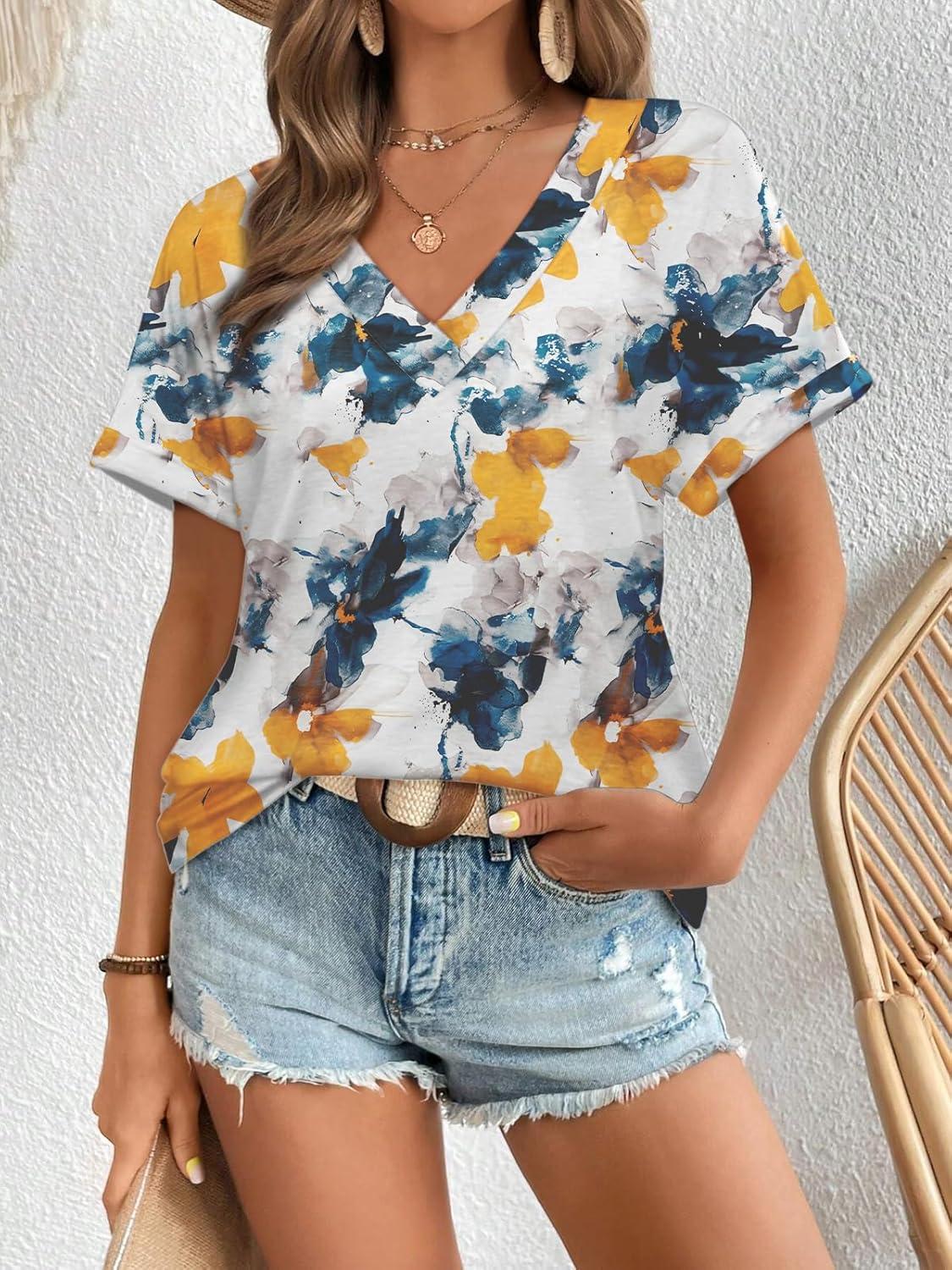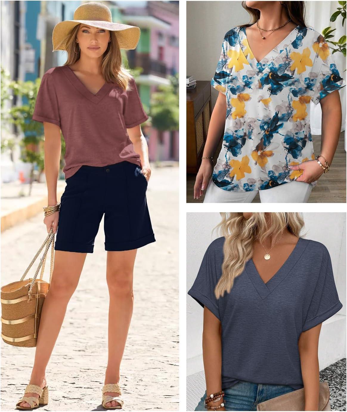 ATHMILE V Neck T Shirts for Women Summer Tops Soft Casual Short Sleeve Cute Basic Trendy Outfits 2025(Multiteal)