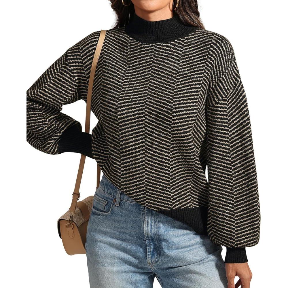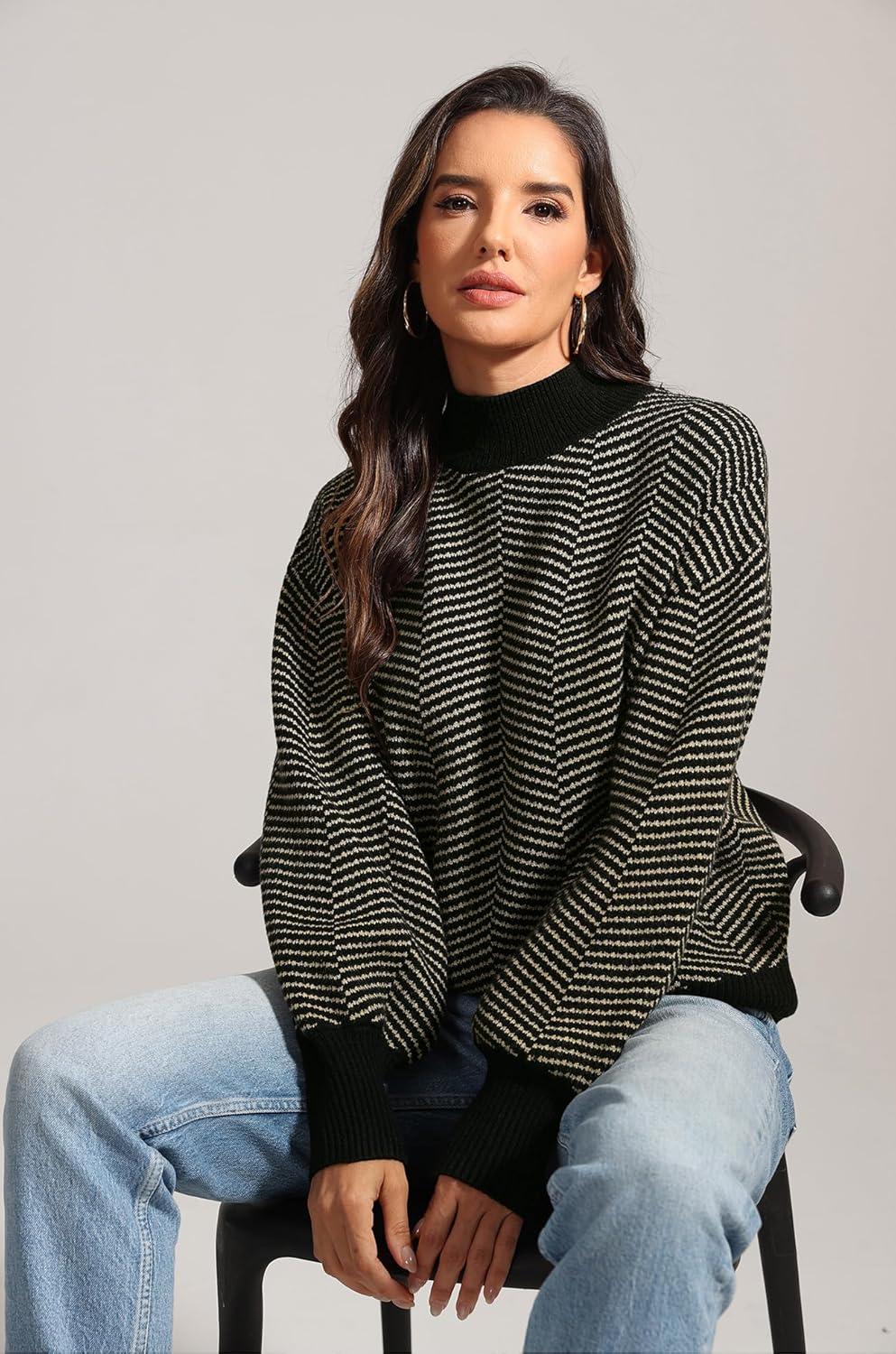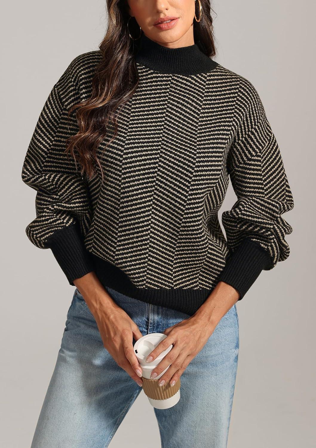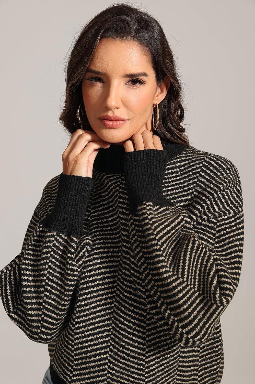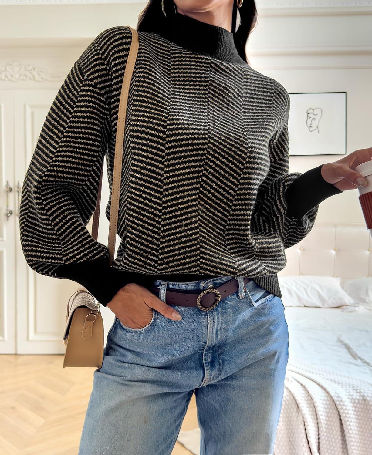 ATHMILE Womens Fashion Turtleneck Sweater Long Sleeve Plaid Ribbed Knit Loose Pullover Tops Trendy Office Outfits(Brownstripe)
