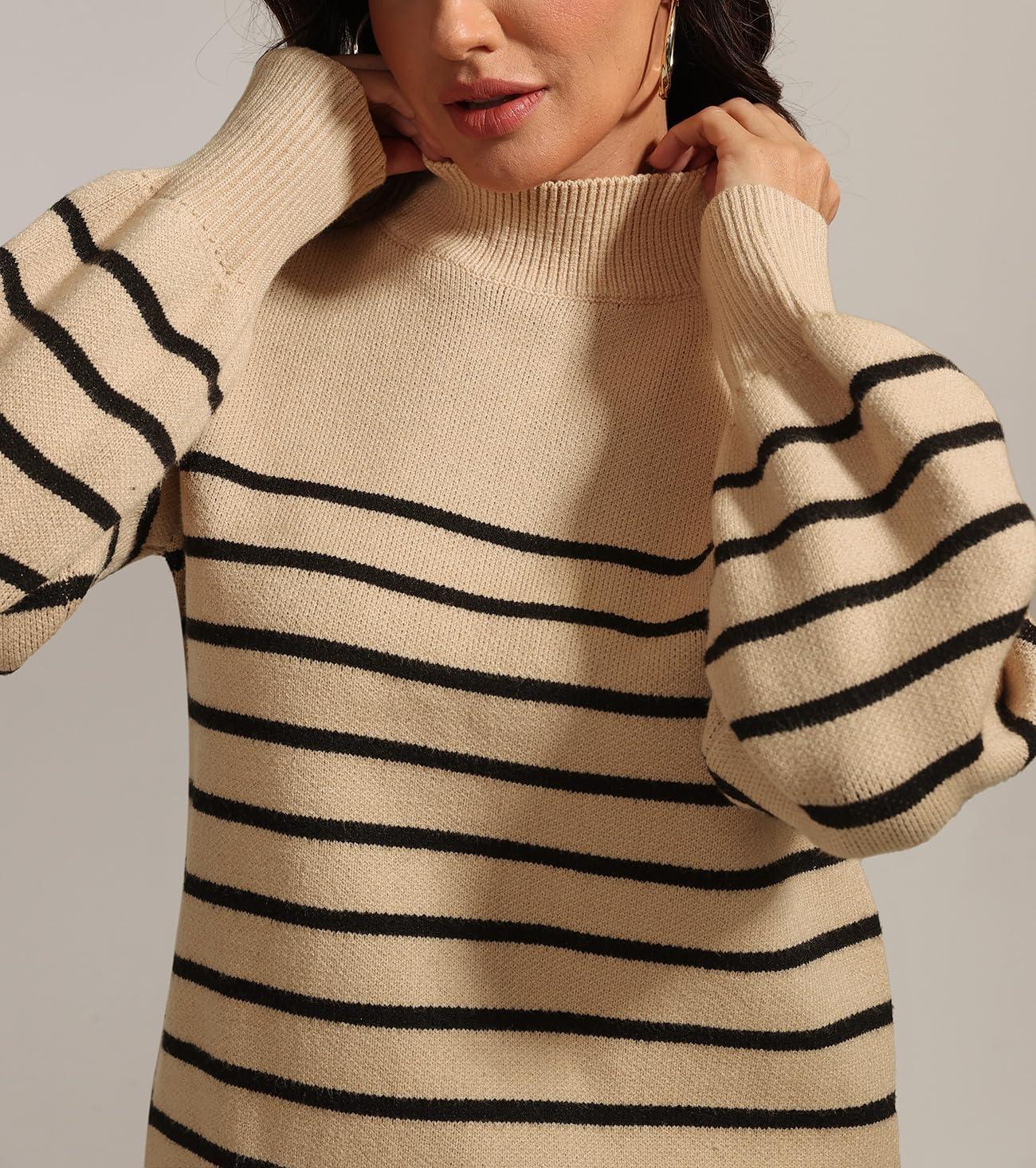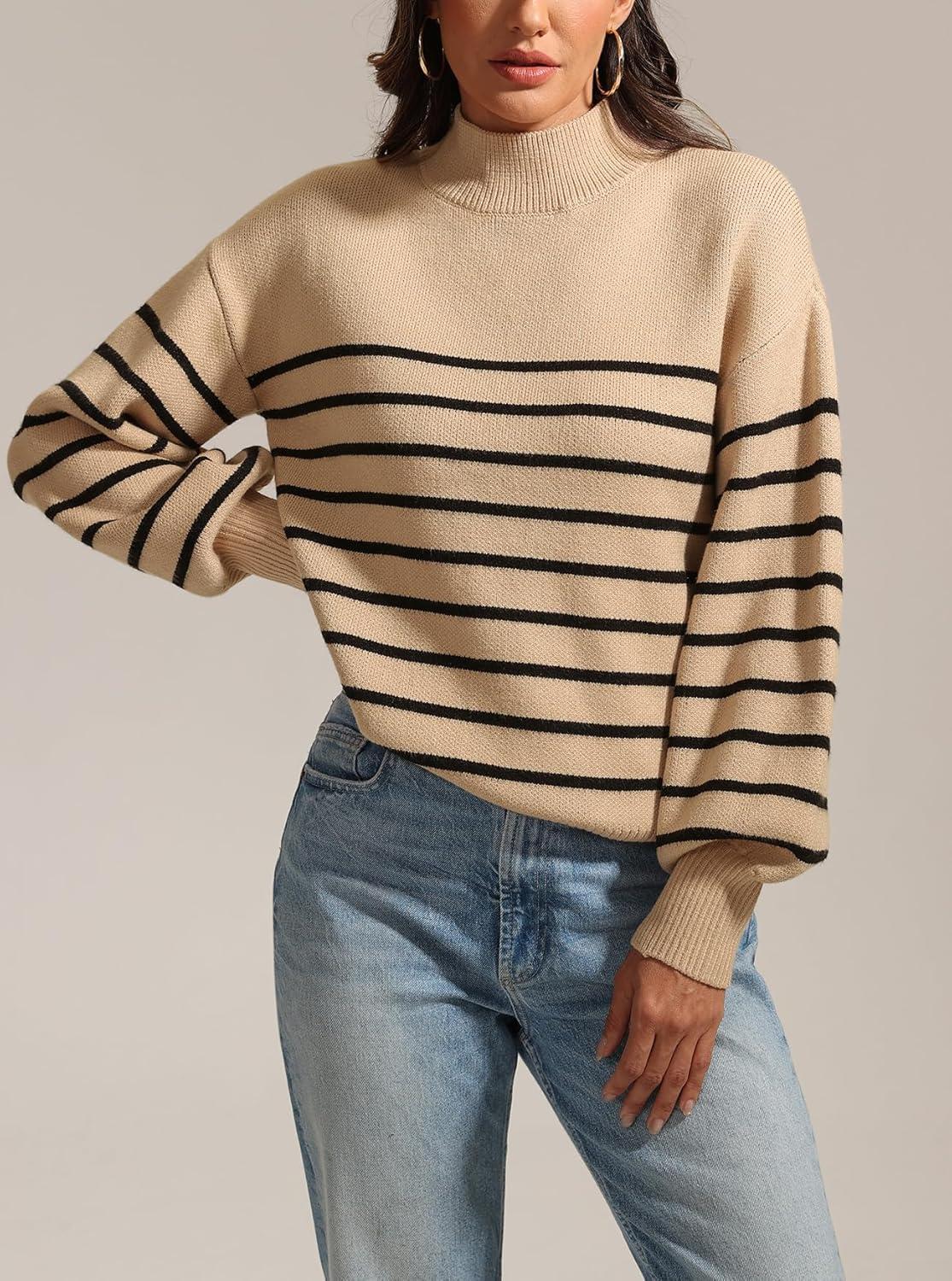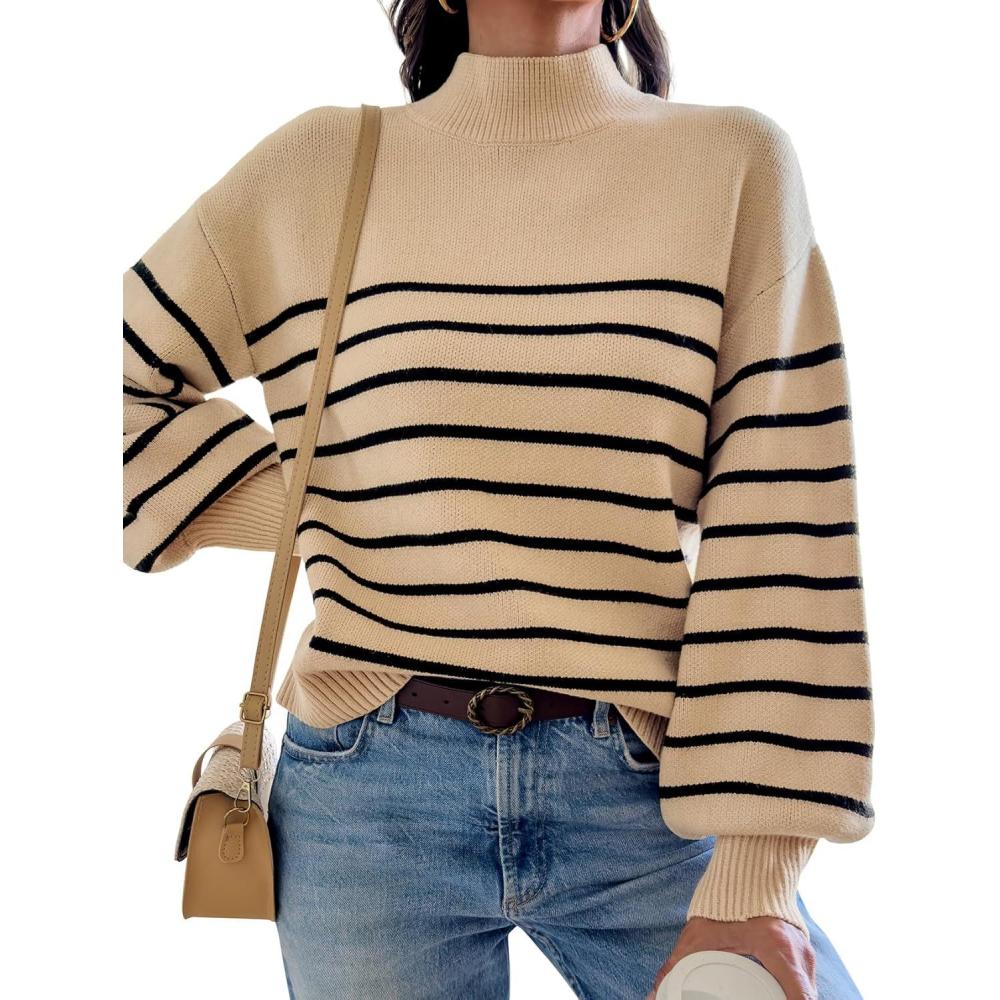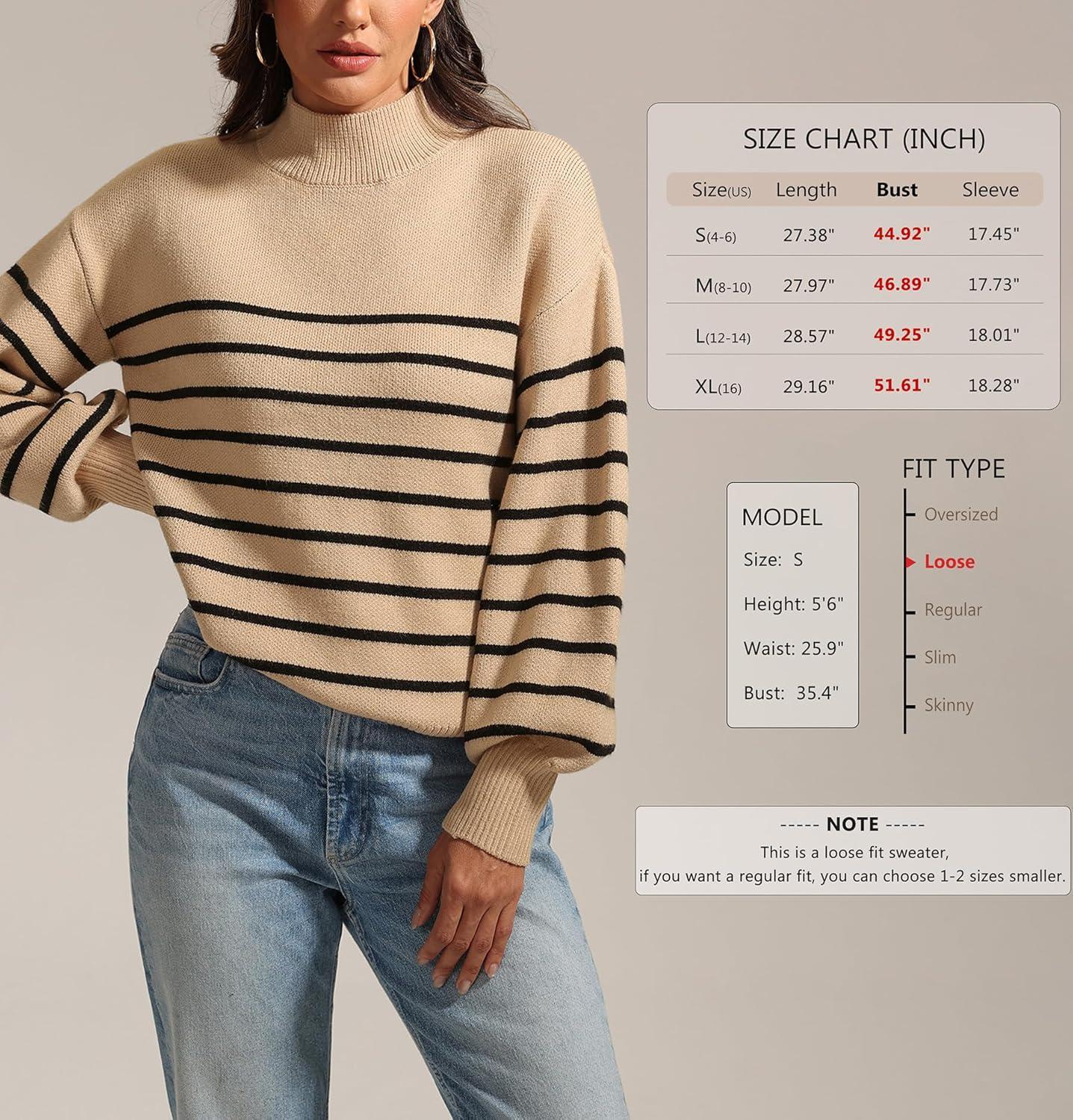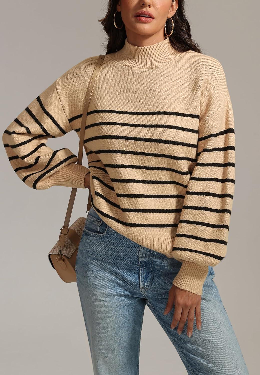 ATHMILE Womens Fashion Turtleneck Sweater Long Sleeve Plaid Ribbed Knit Loose Pullover Tops Trendy Office Outfits(Oatmeal)