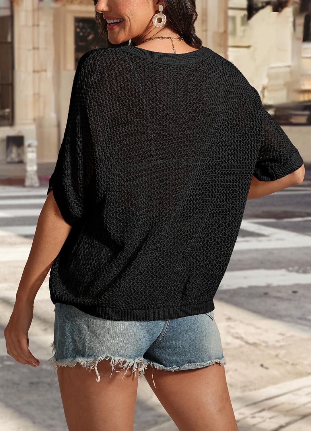 ATHMILE Womens Floral Spring Tops Summer Fashion Shirts Short Sleeve Beach Vacation Crochet Knit Sweater Lightweight Pullover(Black)