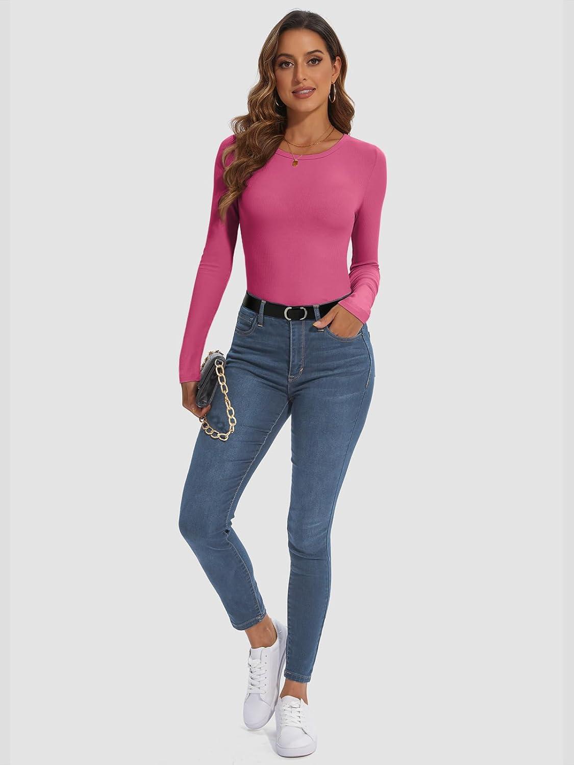 ATHMILE Womens Long Sleeve Crewneck Ribbed Tops Fall Fitted Stretch Casual Basic T Shirts 2025(A-hot Pink)