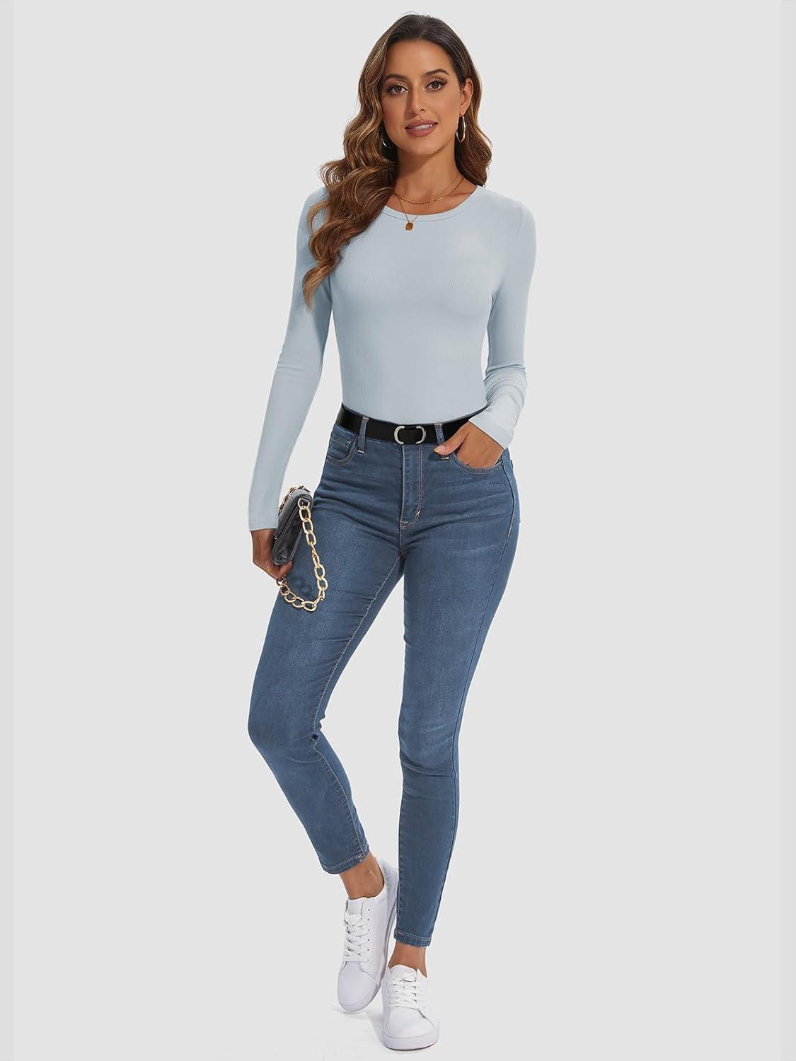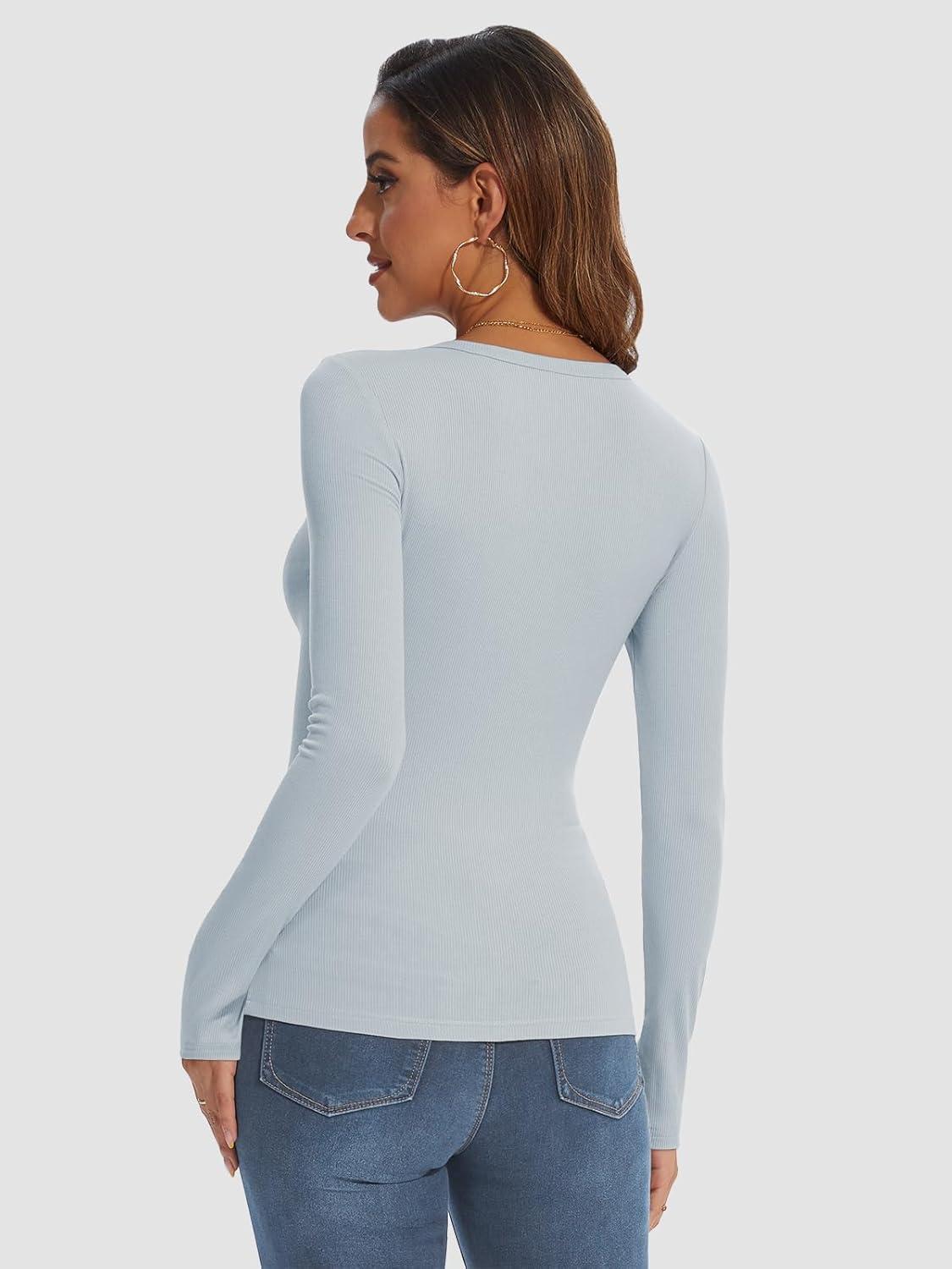 ATHMILE Womens Long Sleeve Crewneck Ribbed Tops Fall Fitted Stretch Casual Basic T Shirts 2025(A-light Blue)