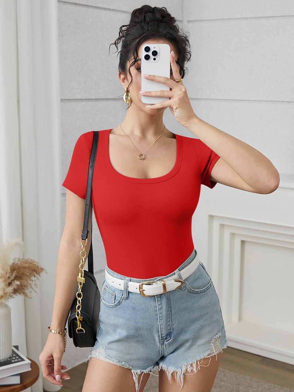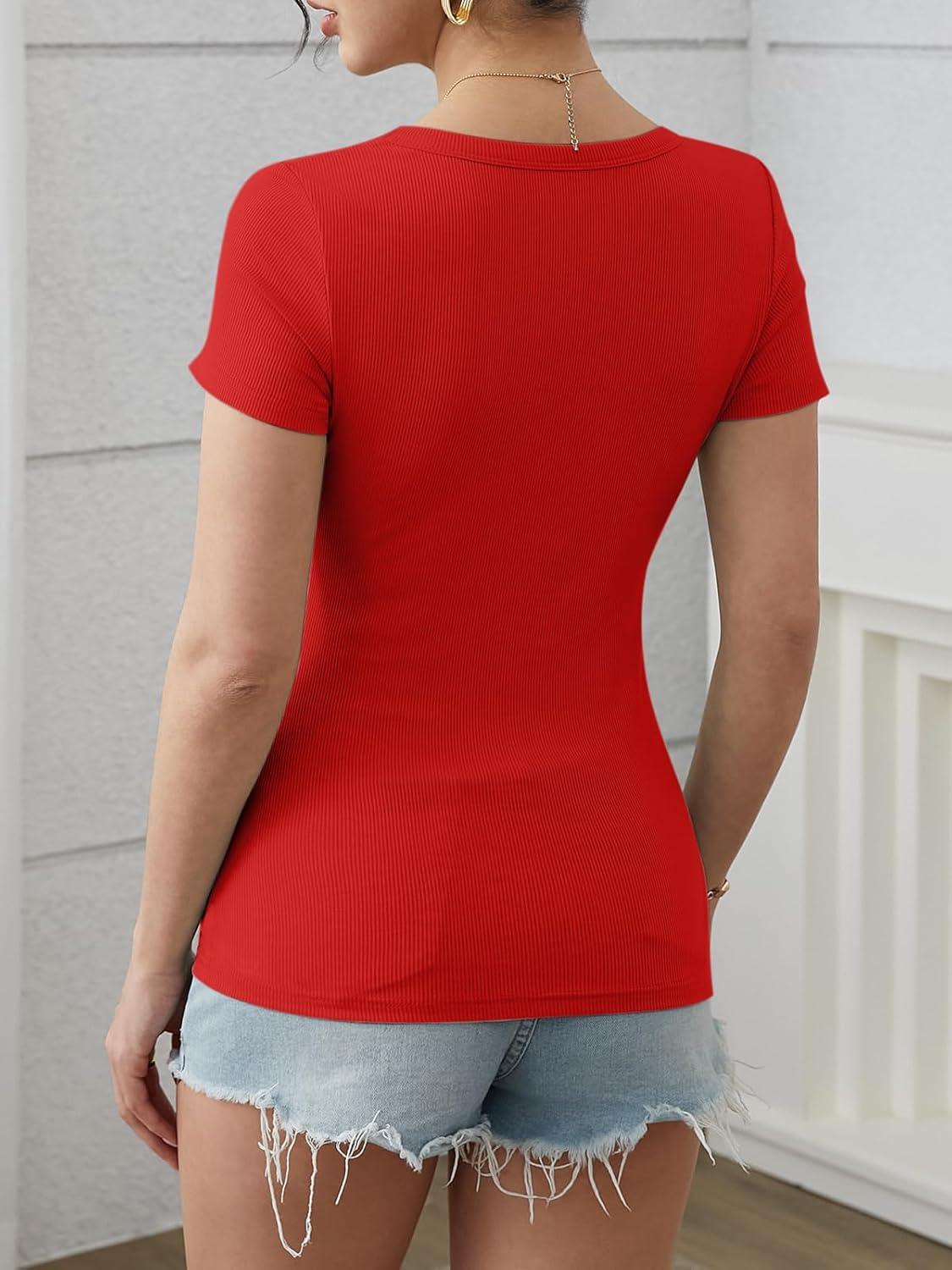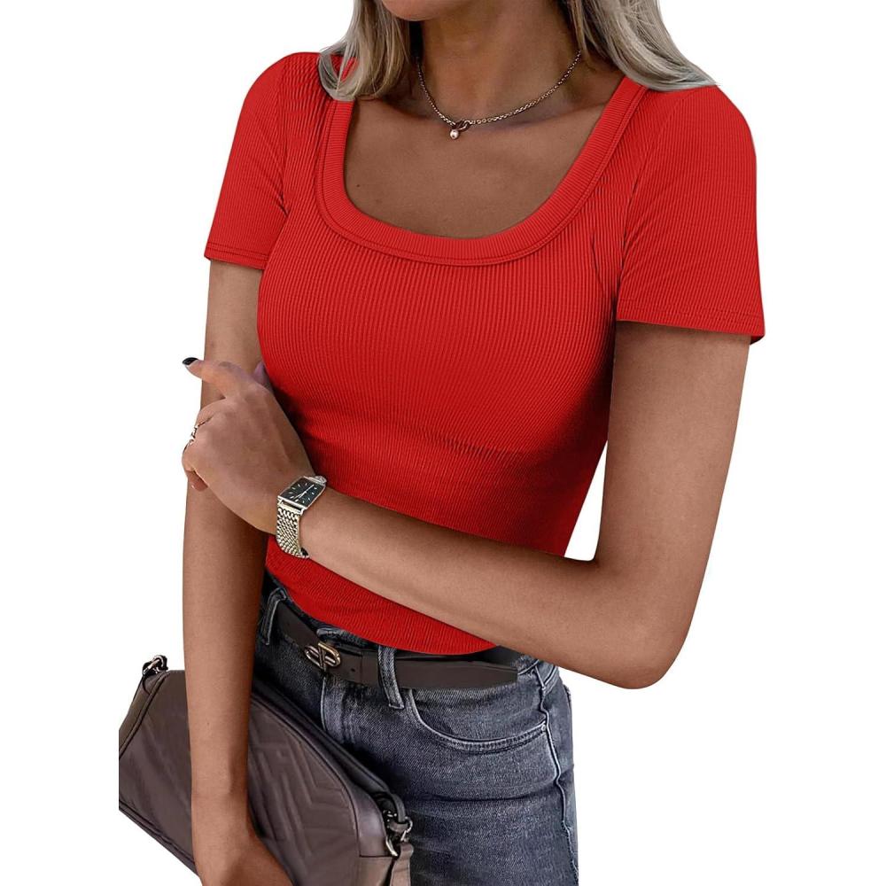 ATHMILE Womens Long Sleeve Tops Fall Scoop Neck Ribbed Knit Shirts Slim Fitted Casual Basic Tee T Shirt for Women 2025(C-red)