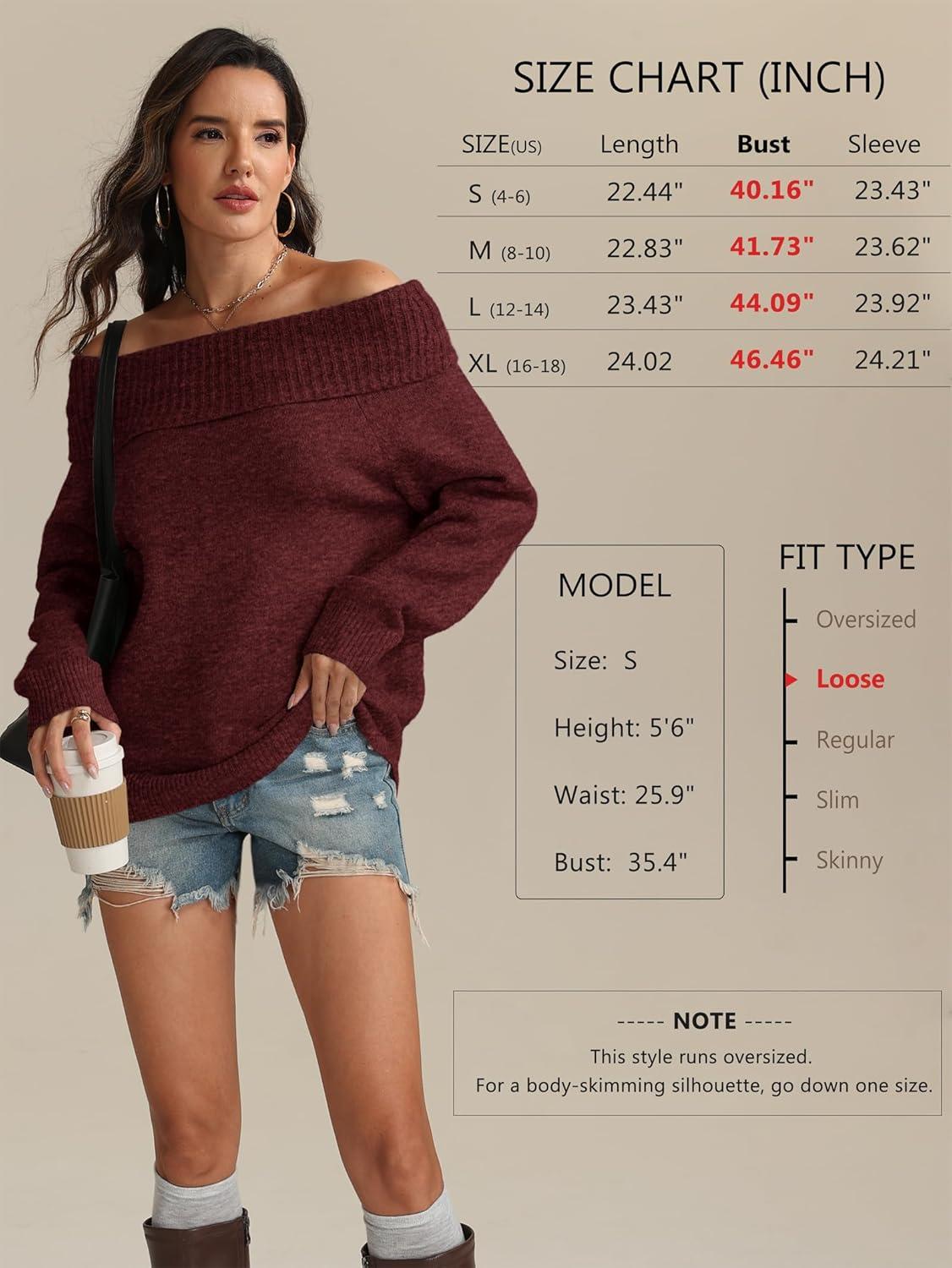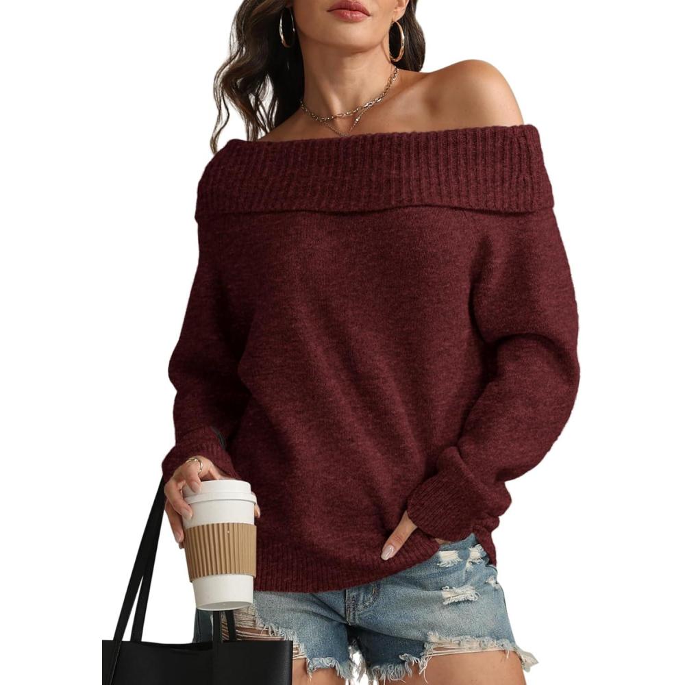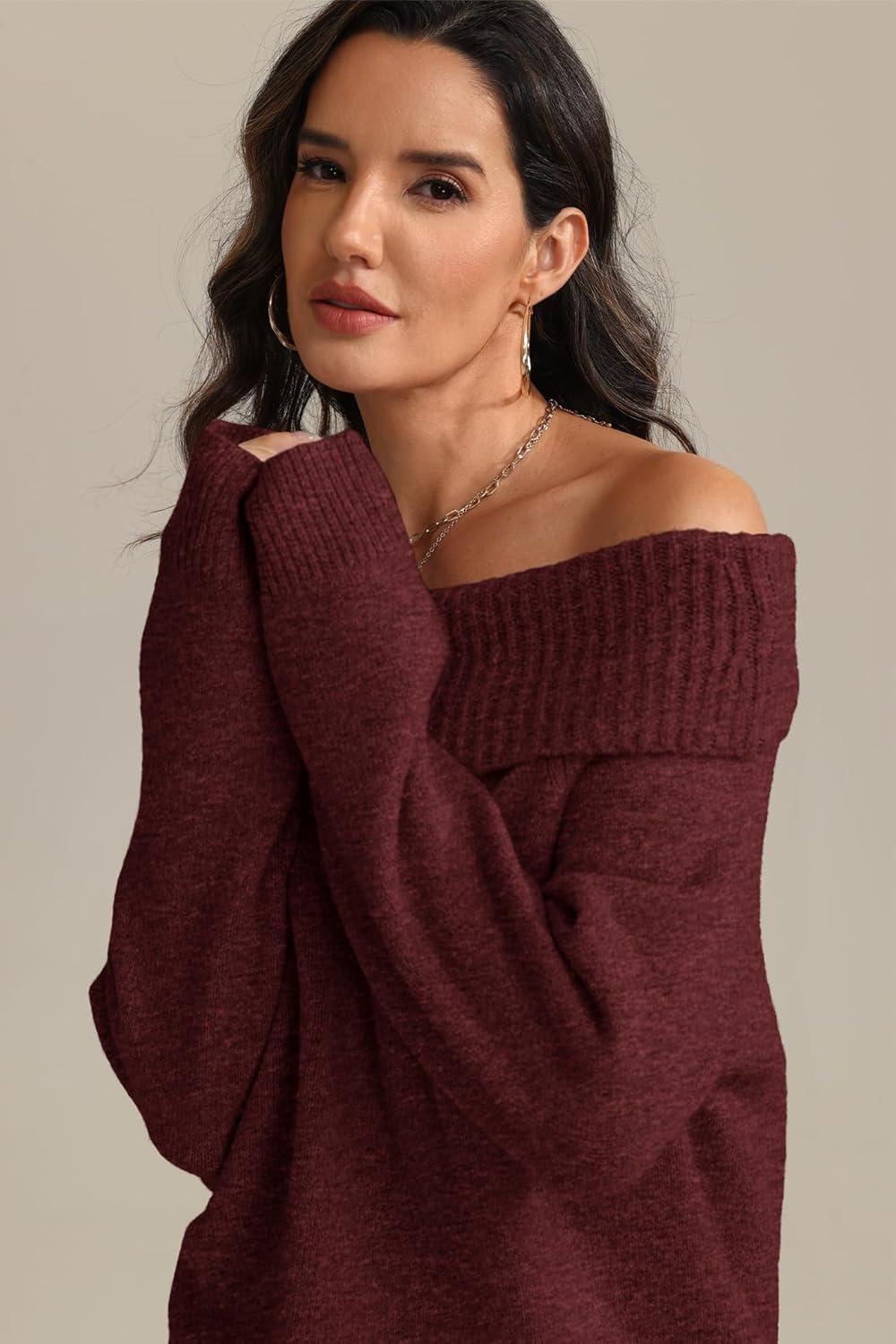 ATHMILE Womens Off The Shoulder Sweaters Oversized Batwing Sleeve Loose Pullover Fall Outfits Winter Fashion Tops 2025(Wine Red)