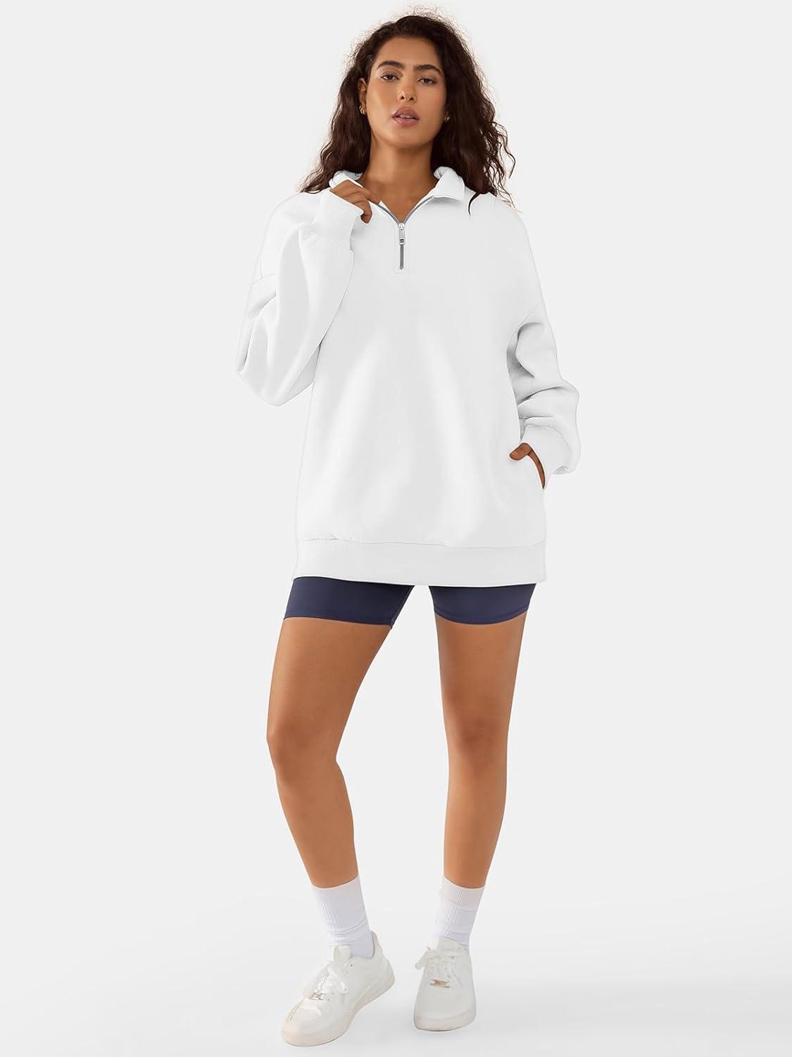 ATHMILE Womens Oversized Sweatshirts Fall Fashion Hoodies Half Zip Fleece Pullover Long Sleeve Y2K Clothes with Side Pockets(White)
