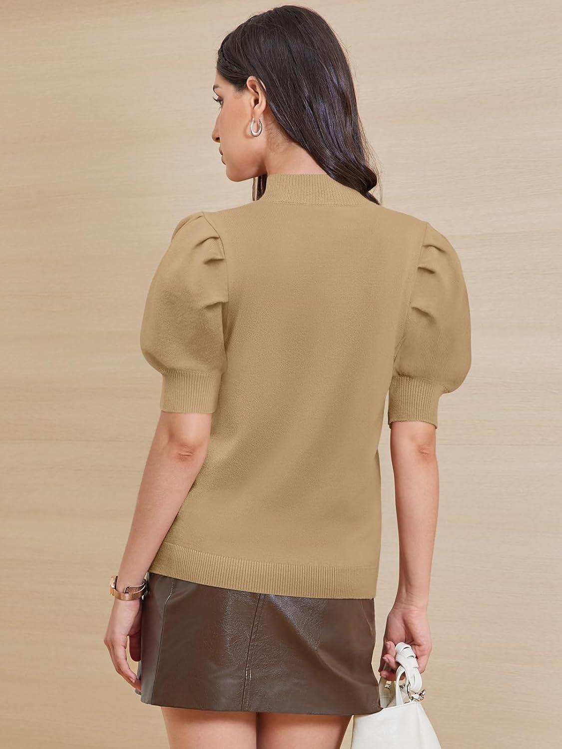 ATHMILE Women’s Puff Short Sleeve Sweater Tops 2025 Spring Summer Fall Trendy Casual T Shirts Blouses(A-khaki)