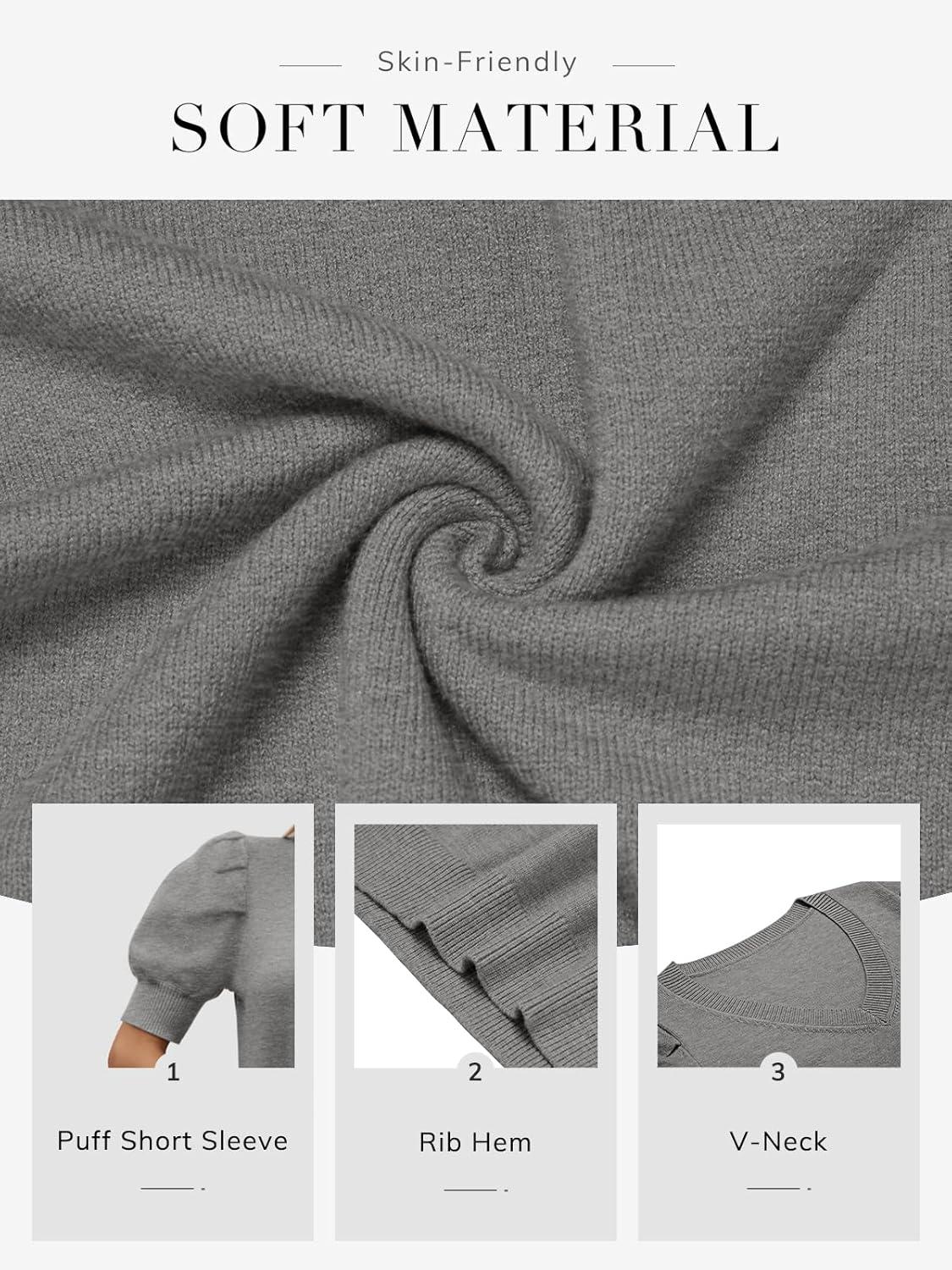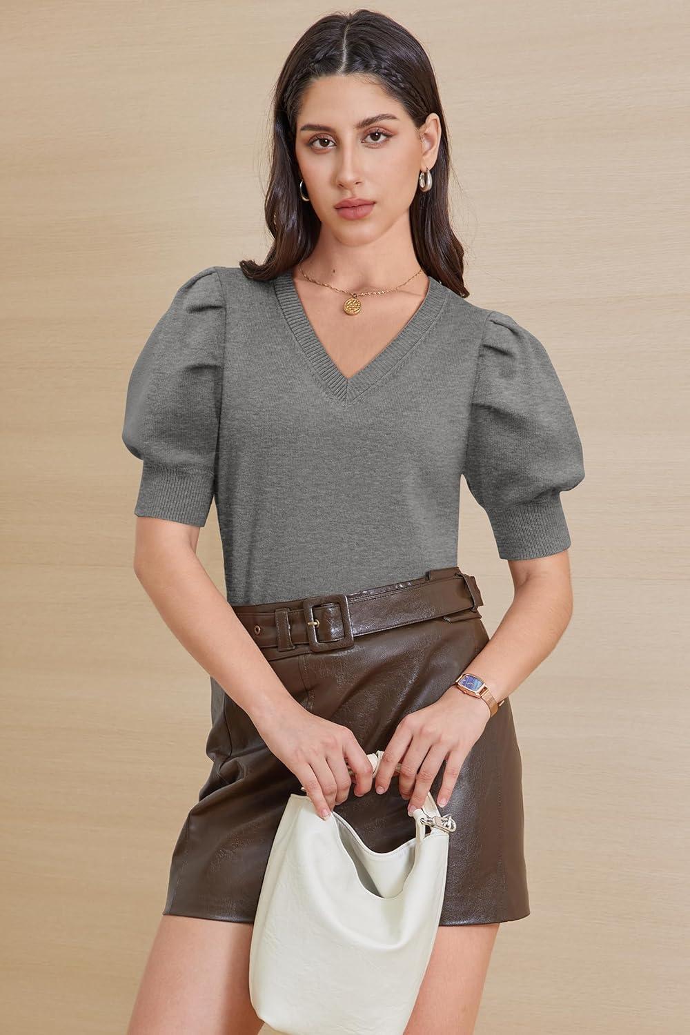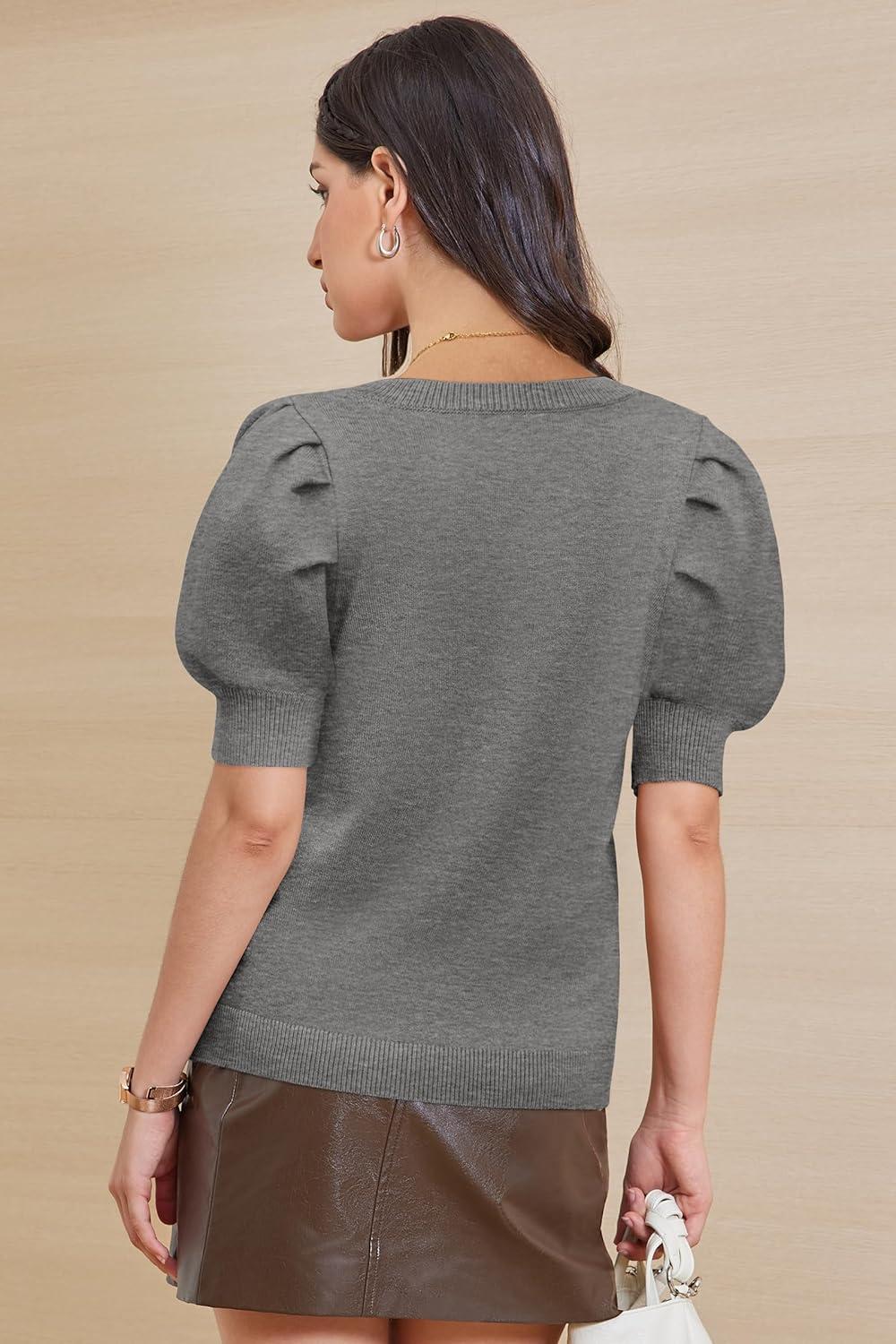 ATHMILE Women’s Puff Short Sleeve Sweater Tops 2025 Spring Summer Fall Trendy Casual T Shirts Blouses(B-dark Grey)