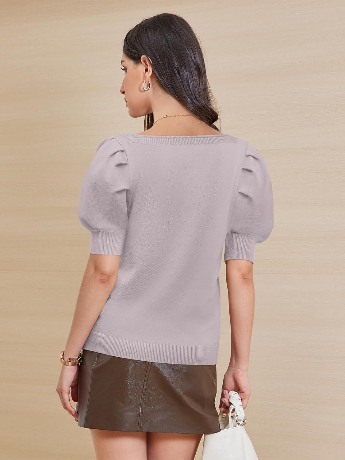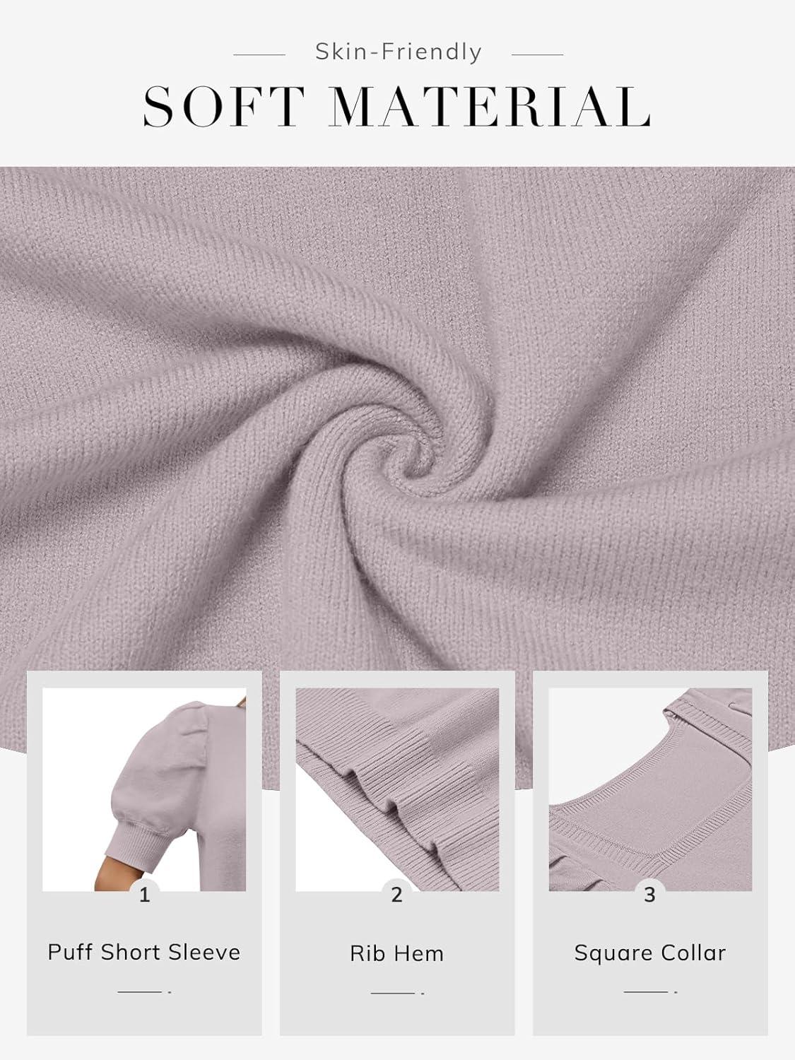 ATHMILE Women’s Puff Short Sleeve Sweater Tops 2025 Spring Summer Fall Trendy Casual T Shirts Blouses(C-grey Purple)