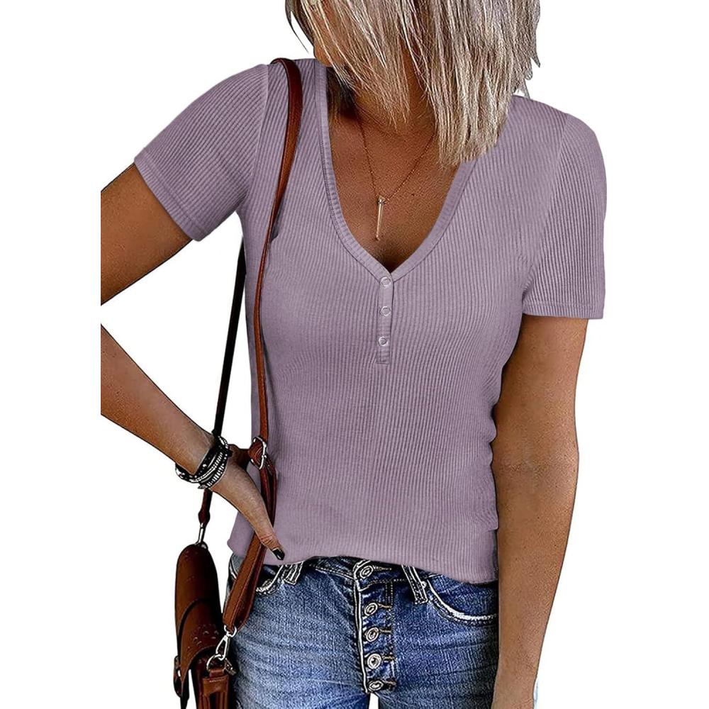 ATHMILE Womens Summer Short Sleeve V Neck Ribbed Knit Button Tunic Henley Solid Color Trendy BasicTee(Taro)
