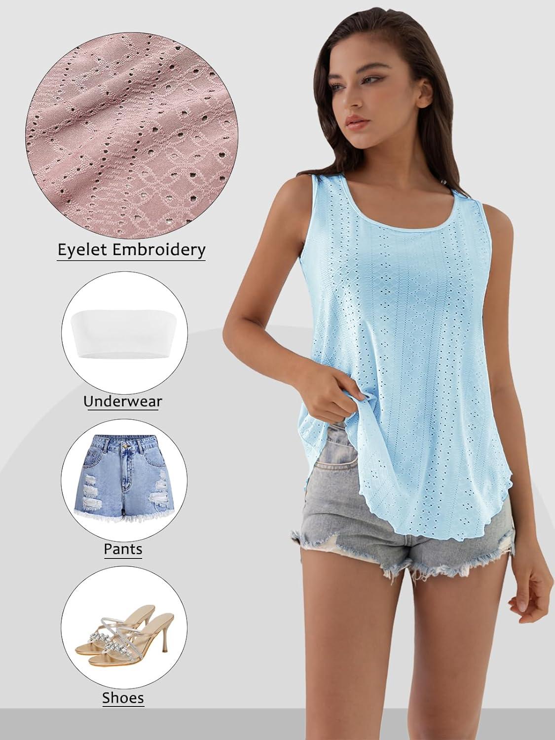ATHMILE Womens Tank Tops Sleeveless Eyelet Embroidery Scoop Neck Loose Fit Casual Summer Flowy Beach(Lightblue)