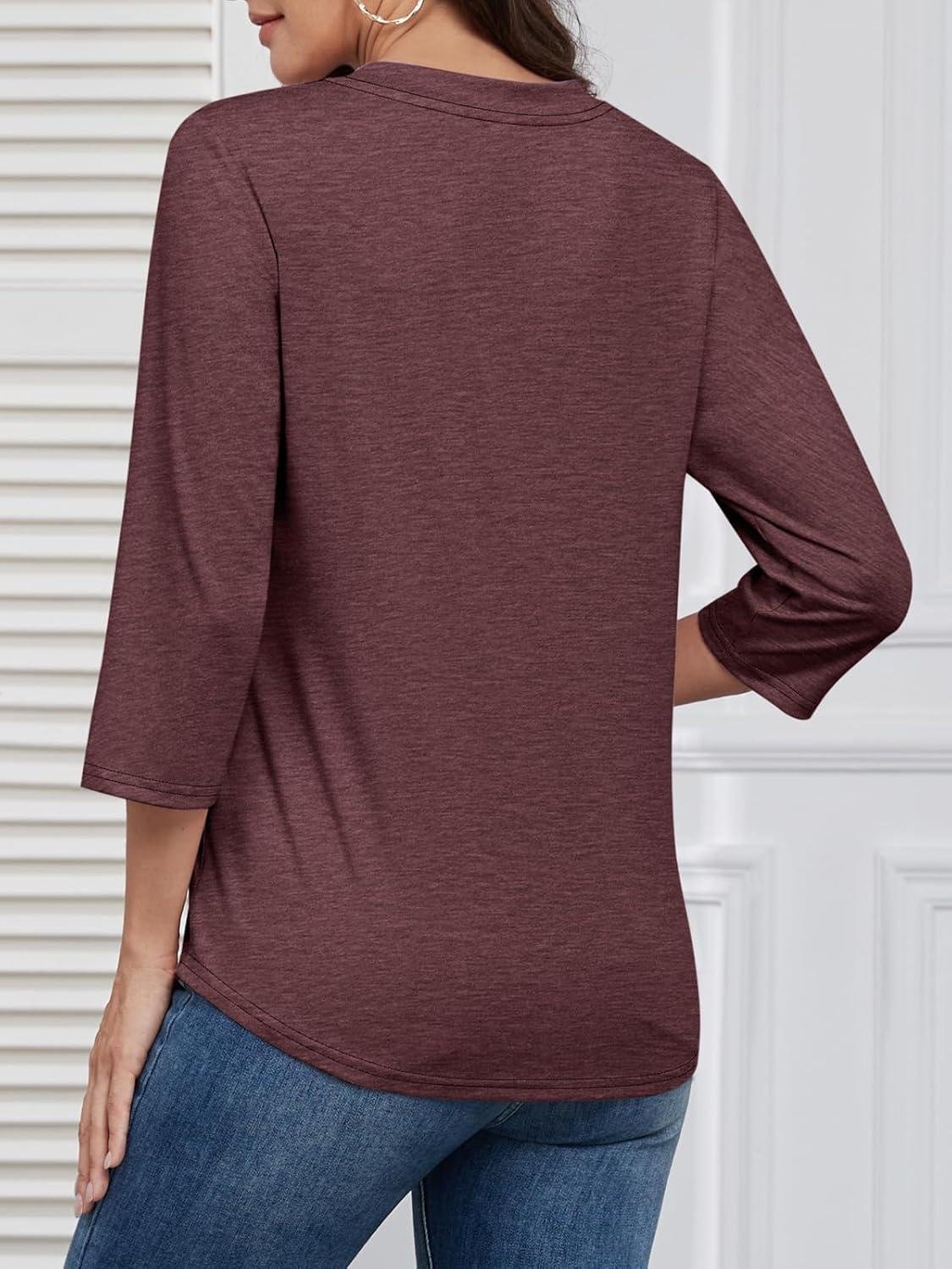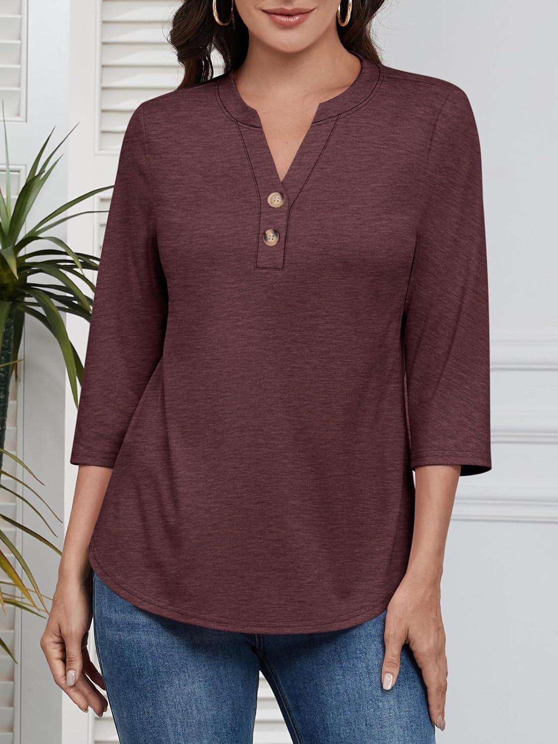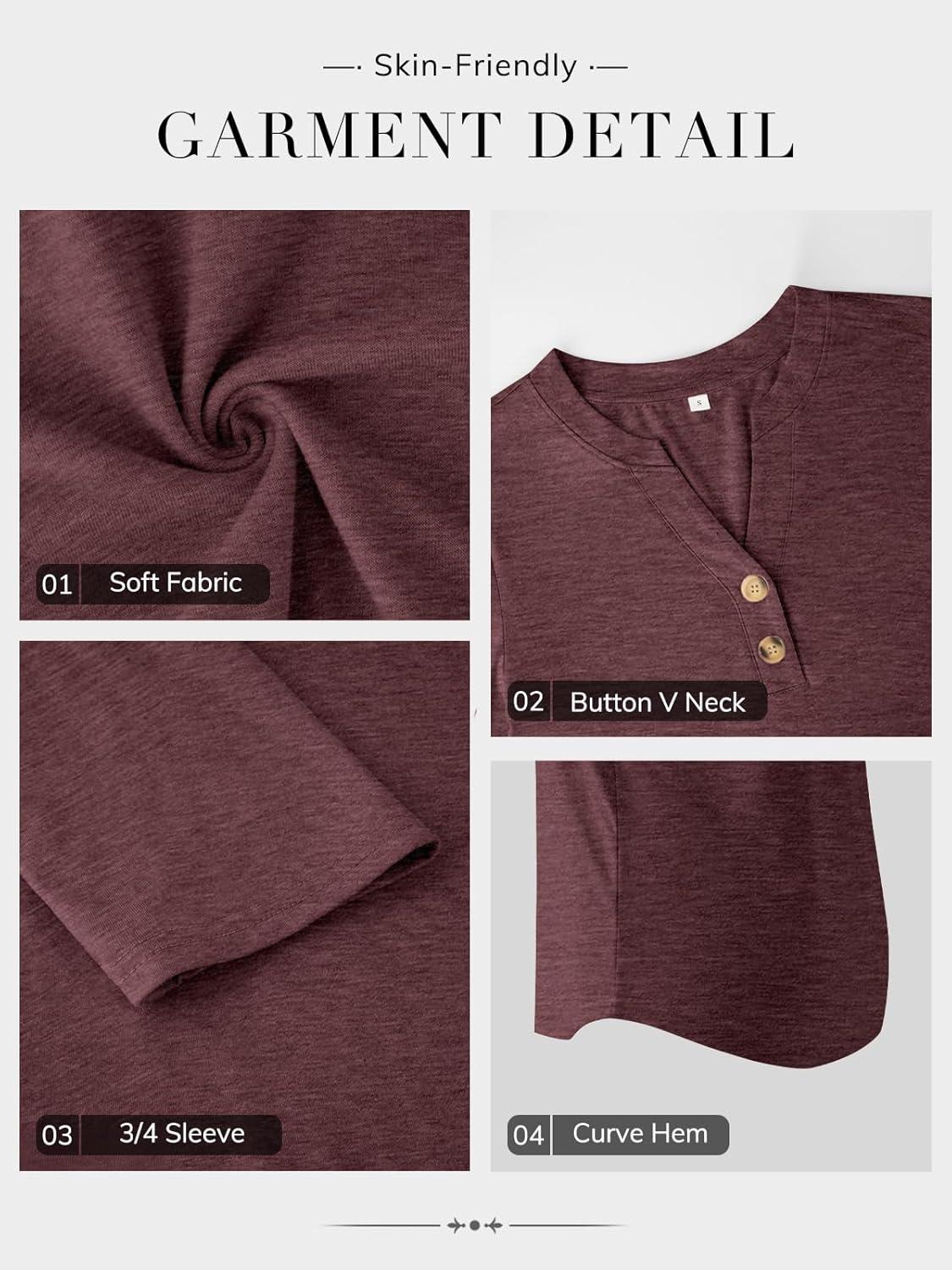 ATHMILE Womens Tops 3/4 Length Sleeve Button Down Henley Shirts Business Casual Outfits Fashion Blouses(Burgundy)