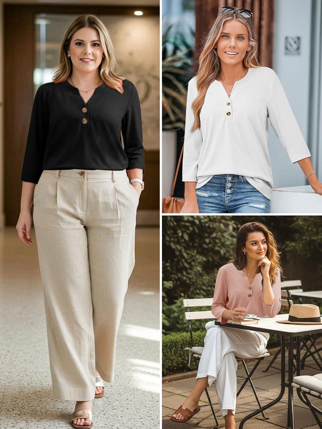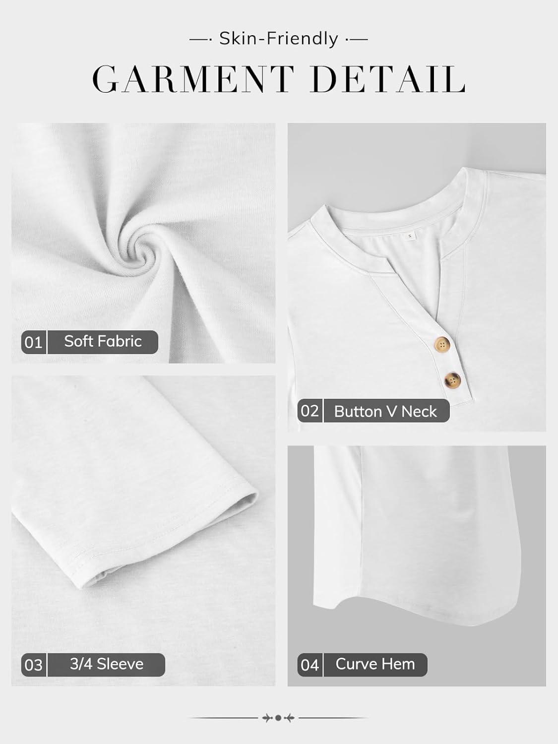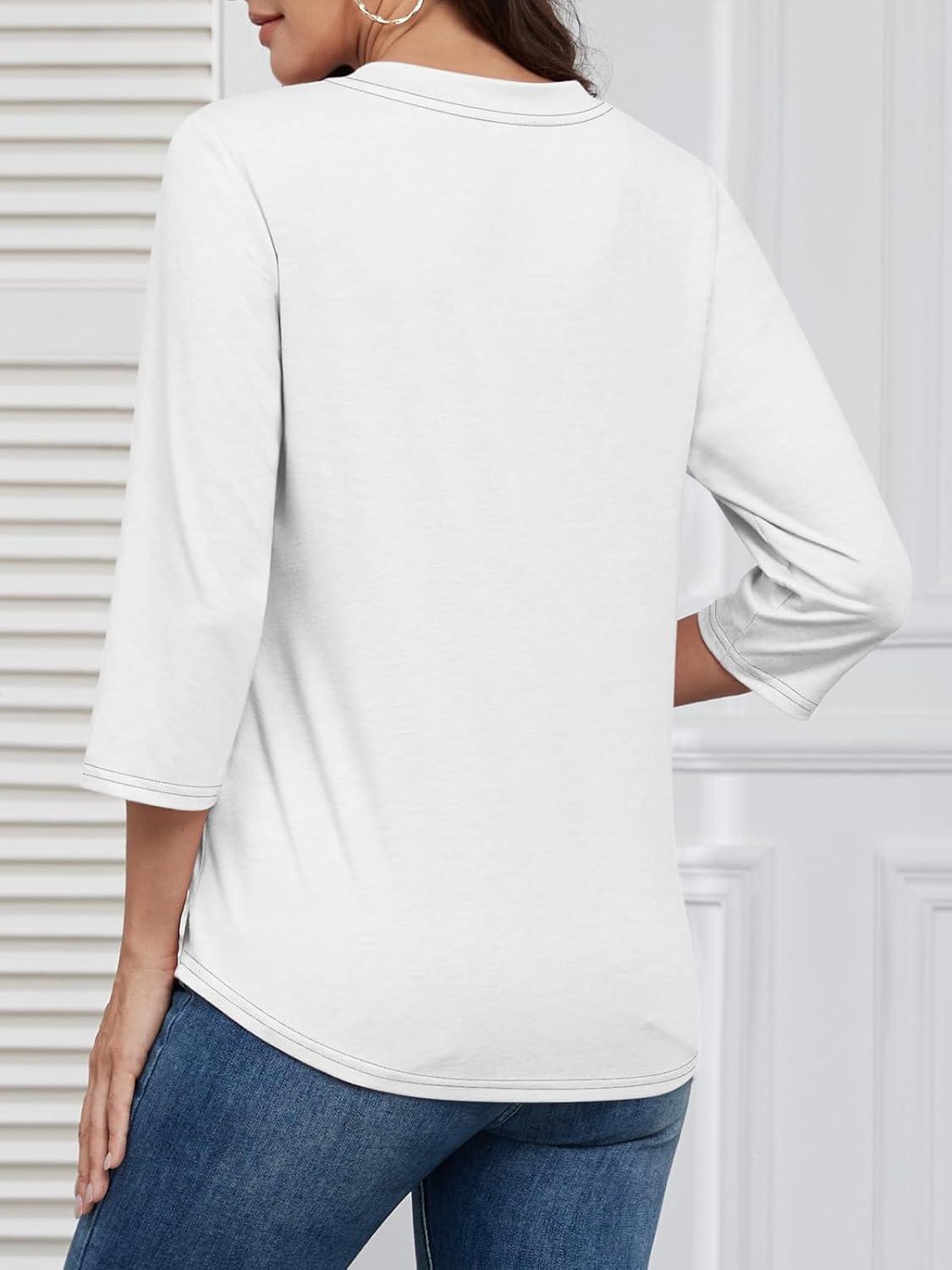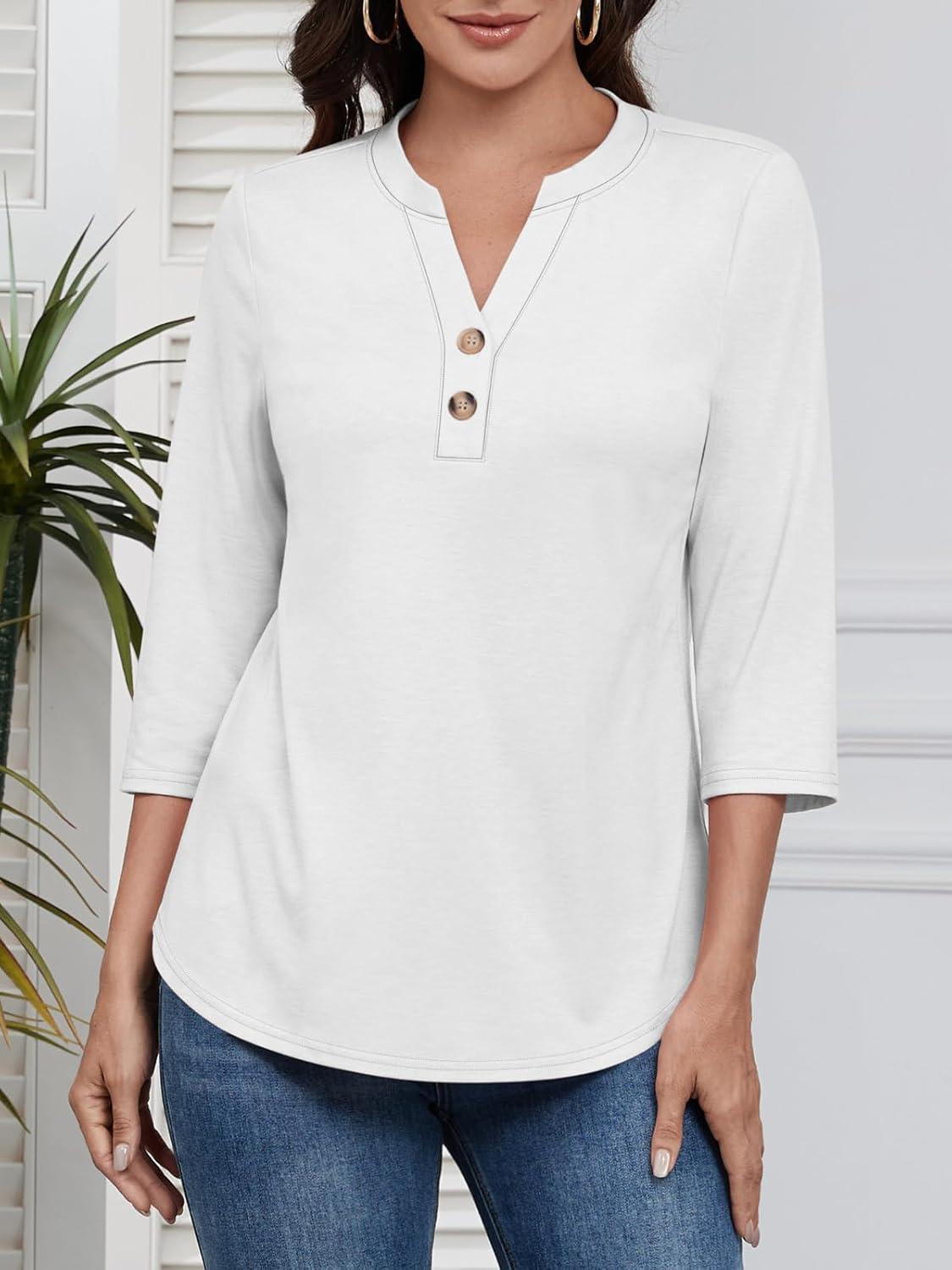 ATHMILE Womens Tops 3/4 Length Sleeve Button Down Henley Shirts Business Casual Outfits Fashion Blouses(White)