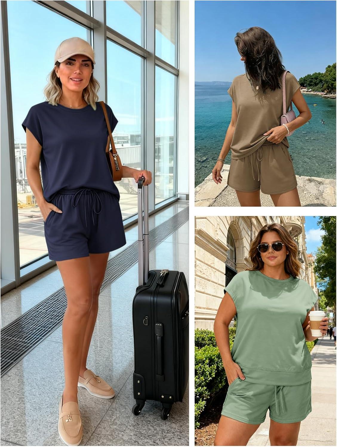ATHMILE Womens Two Piece Sets Summer Crew Neck Cap Sleeve Tops Lounge Shorts Beach Vacation Rompers Outfits With Pockets