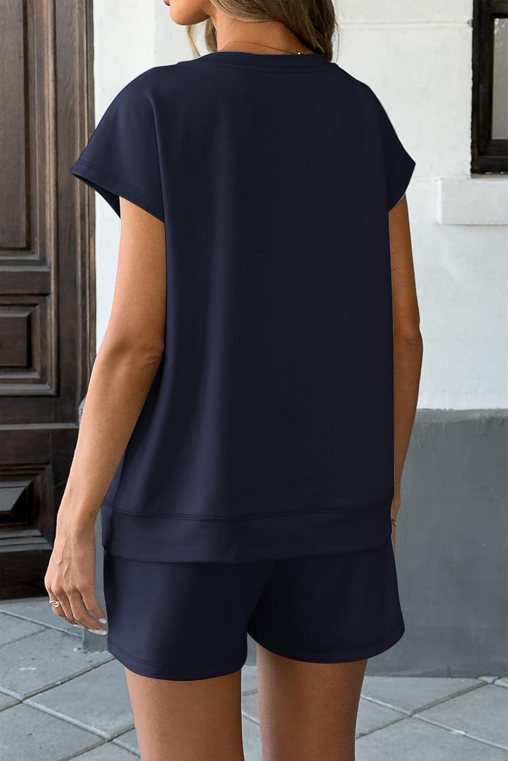 ATHMILE Womens Two Piece Sets Summer Crew Neck Cap Sleeve Tops Lounge Shorts Beach Vacation Rompers Outfits With Pockets