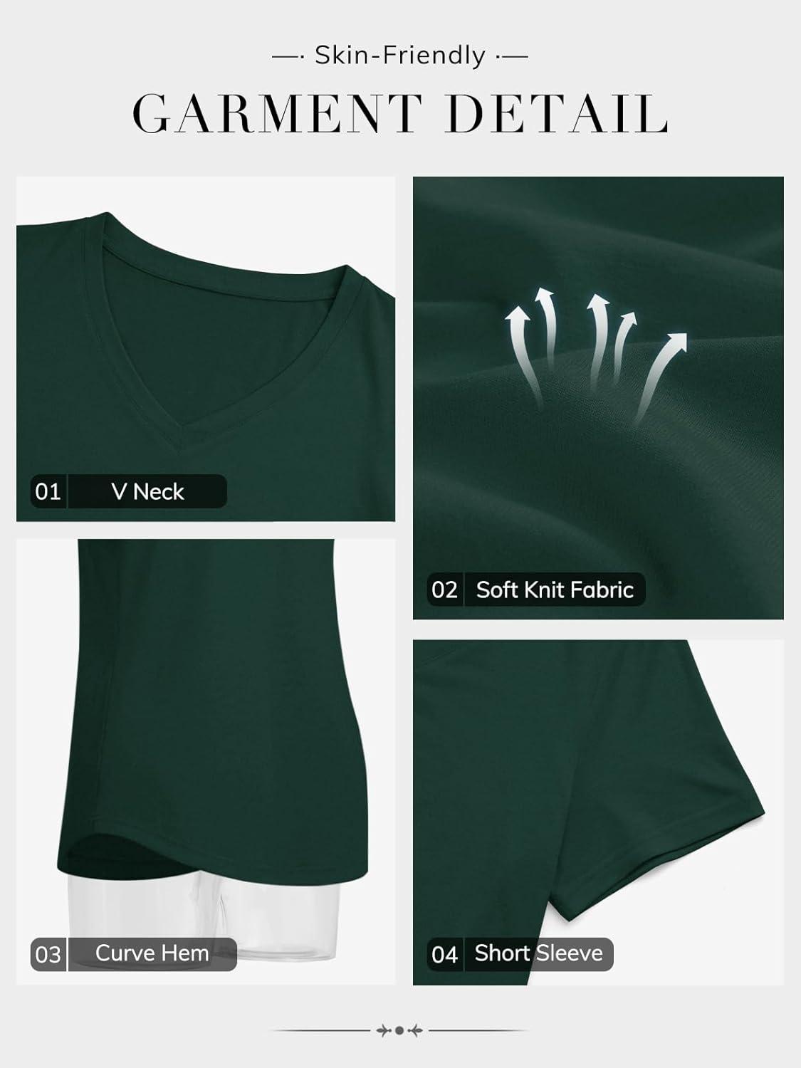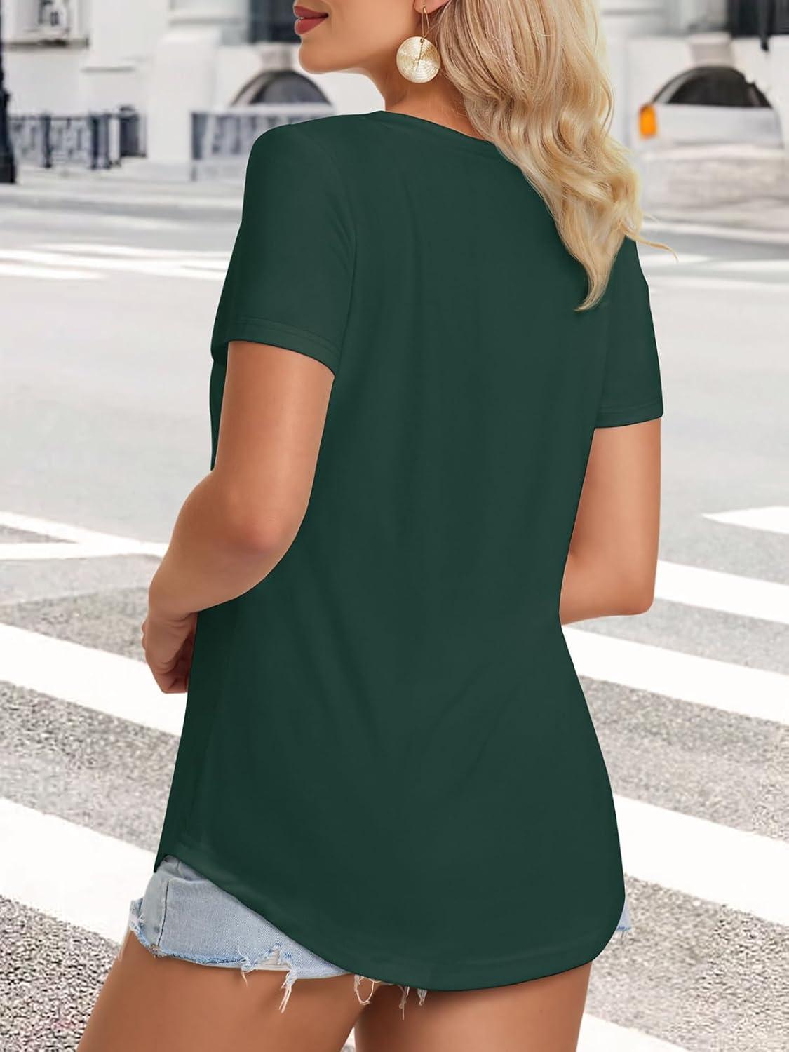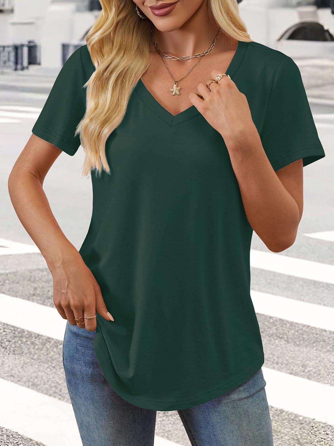 ATHMILE Womens V Neck Short Sleeve Summer T Shirts Curved Hem Plain Top Beach(Deepgreen)