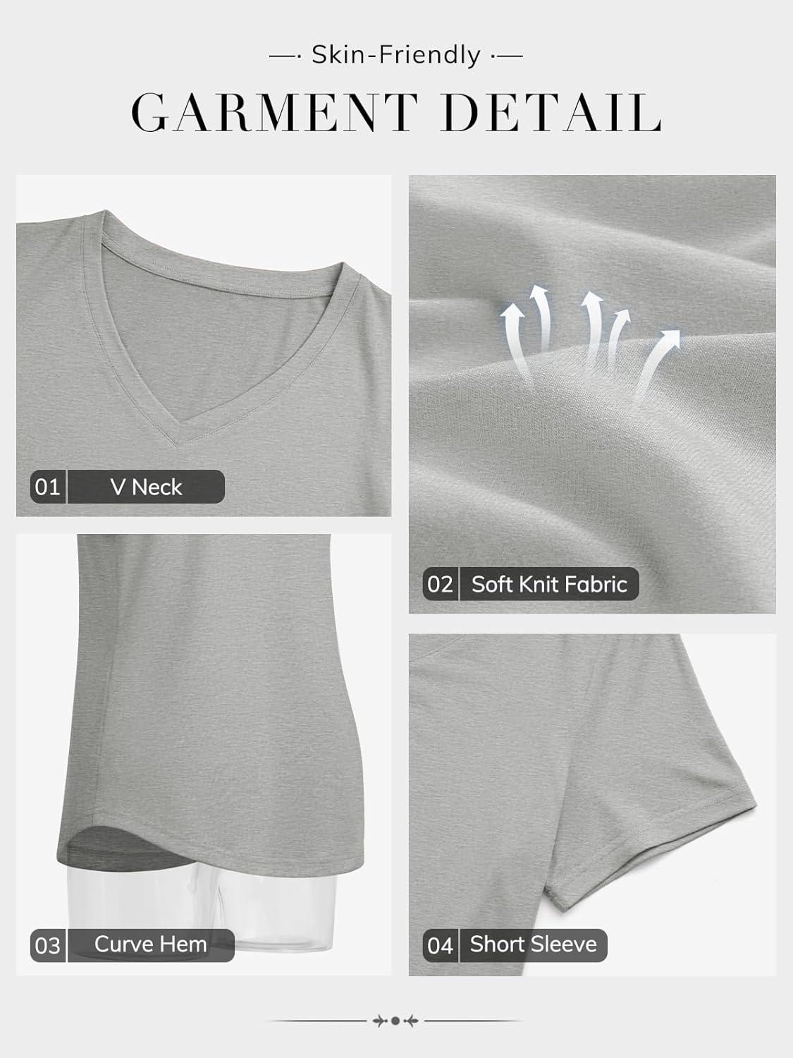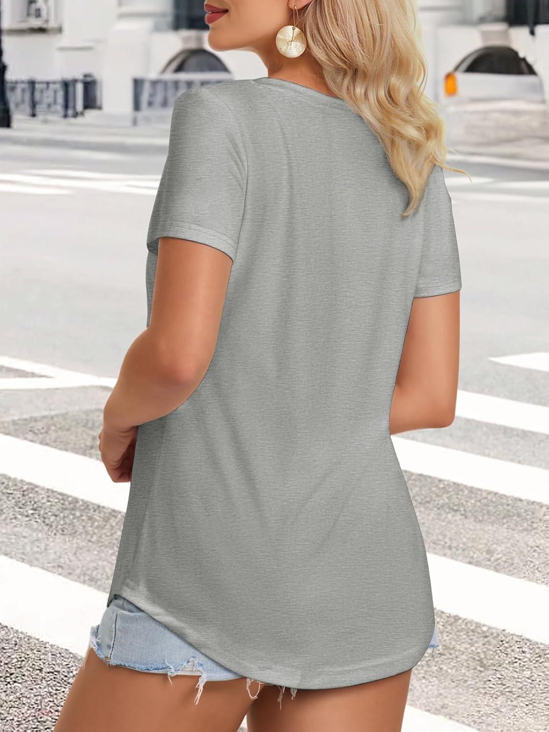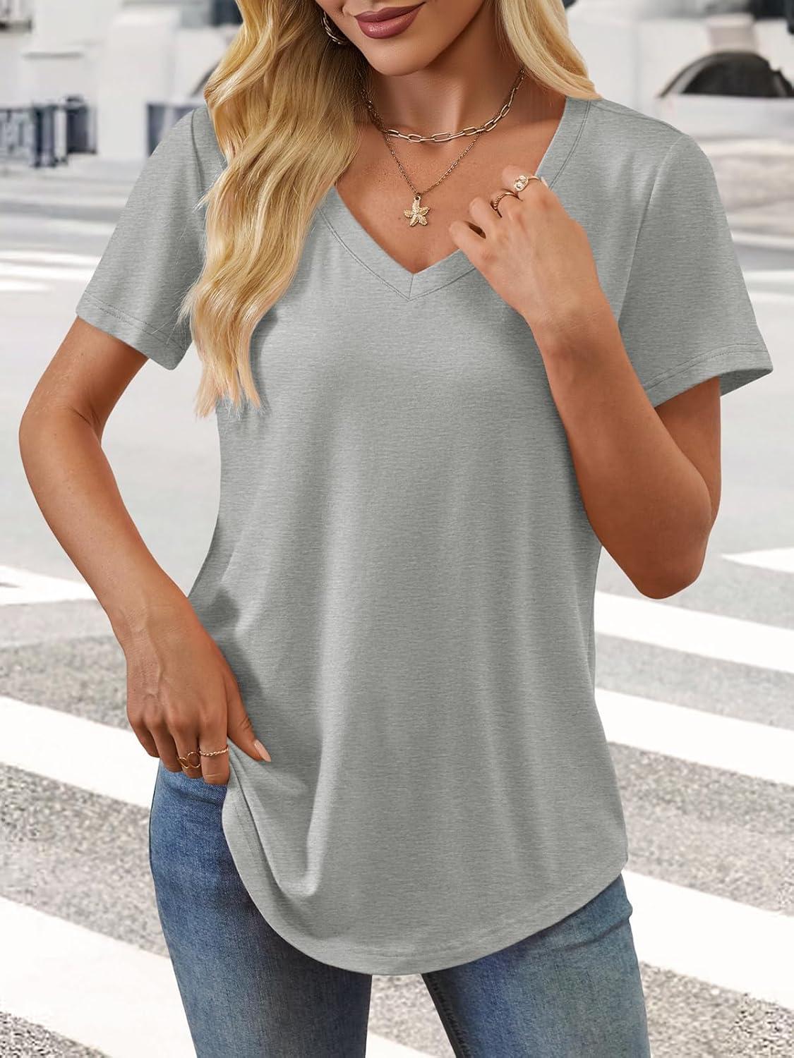 ATHMILE Womens V Neck Short Sleeve Summer T Shirts Curved Hem Plain Top Beach(Grey)