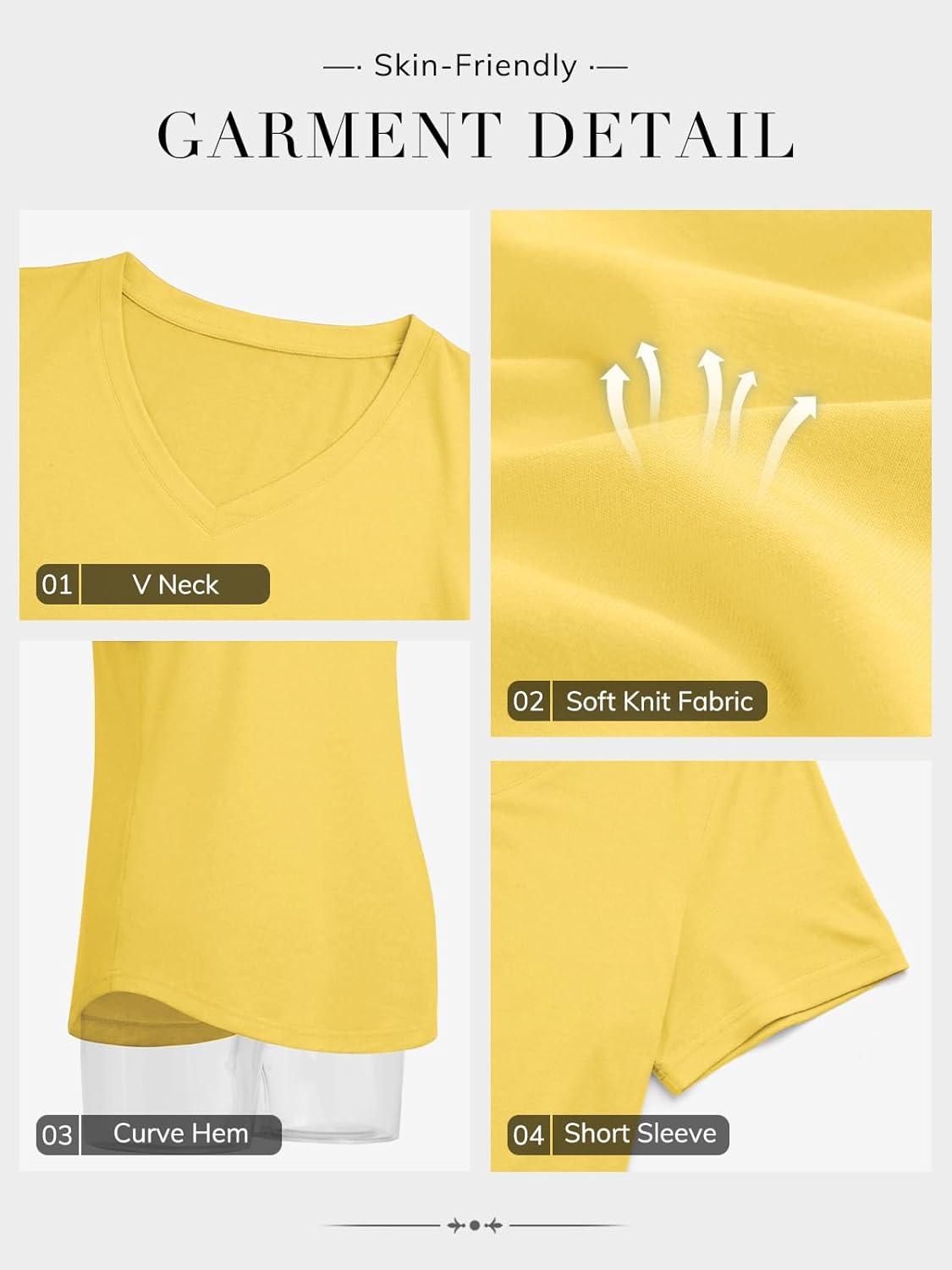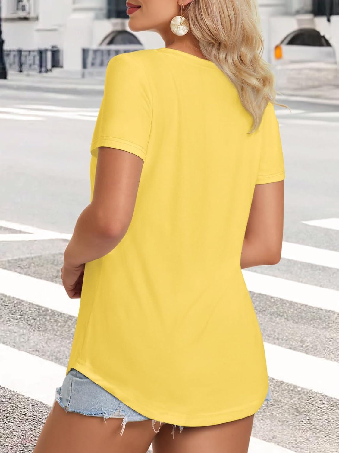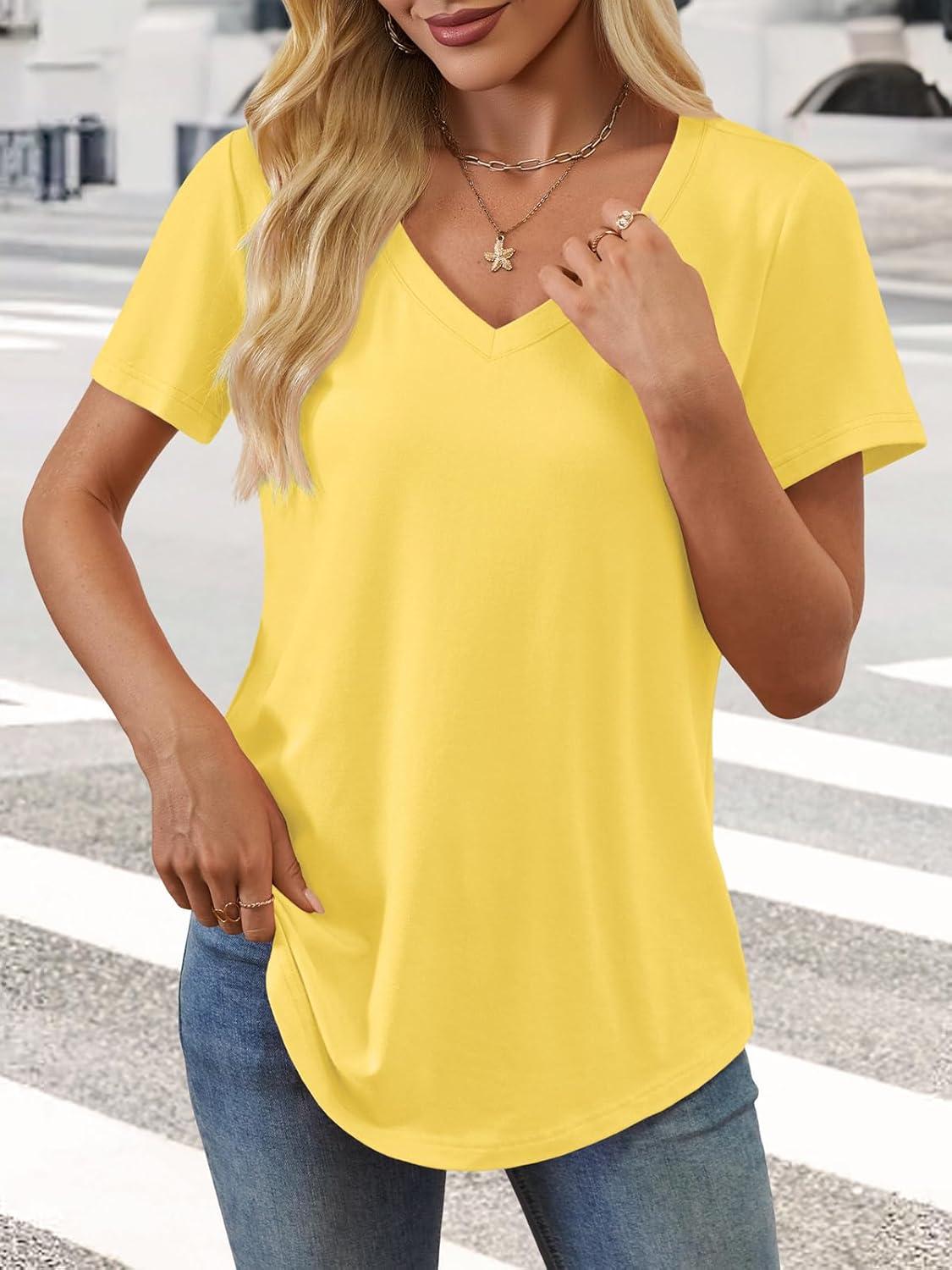 ATHMILE Womens V Neck Short Sleeve Summer T Shirts Curved Hem Plain Top Beach(Lemon)