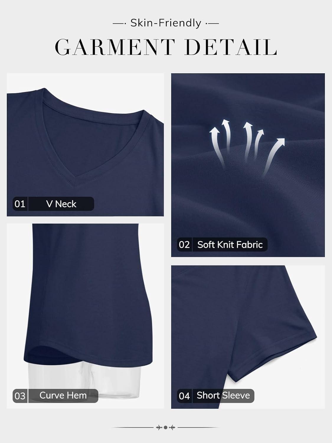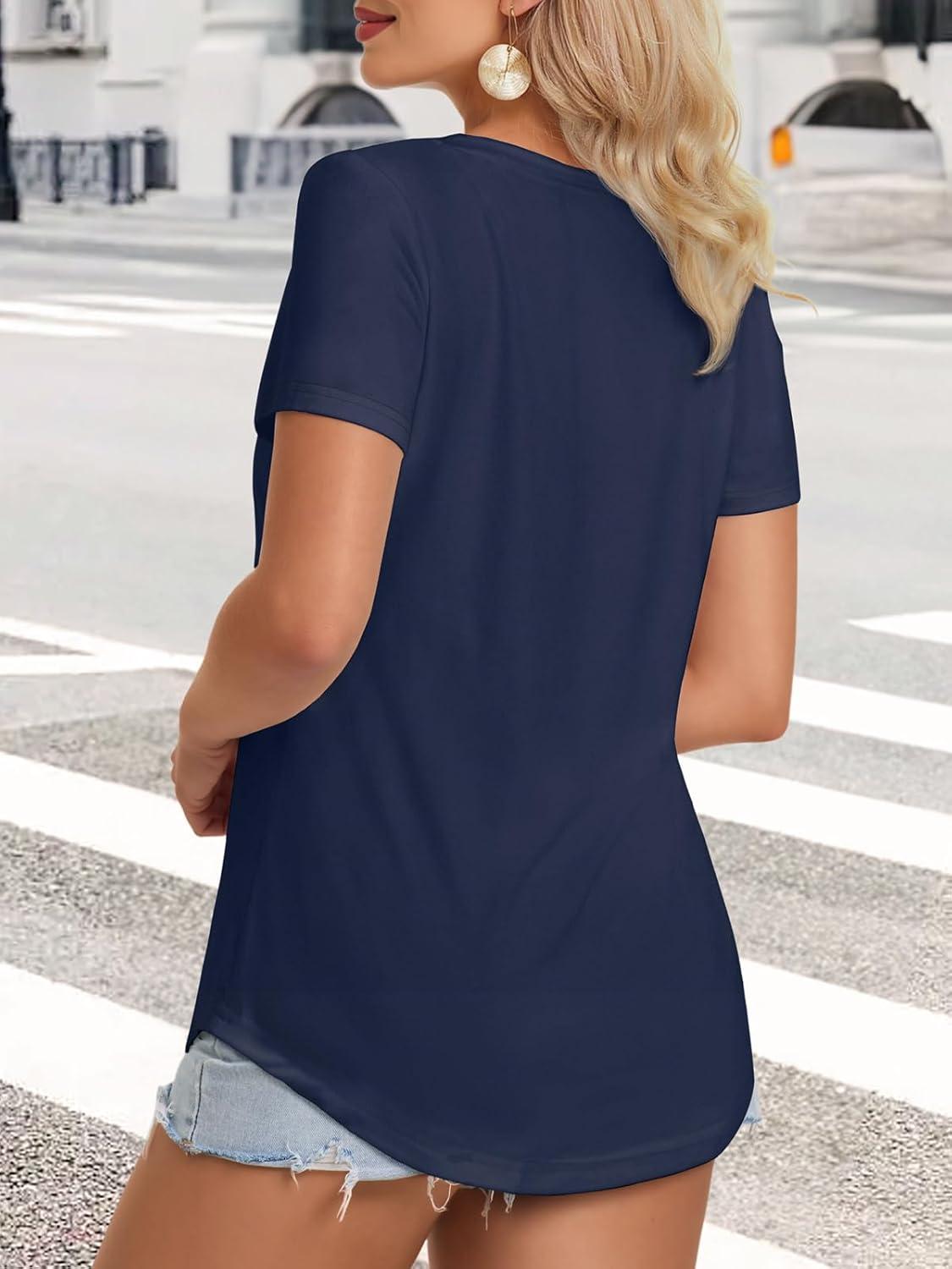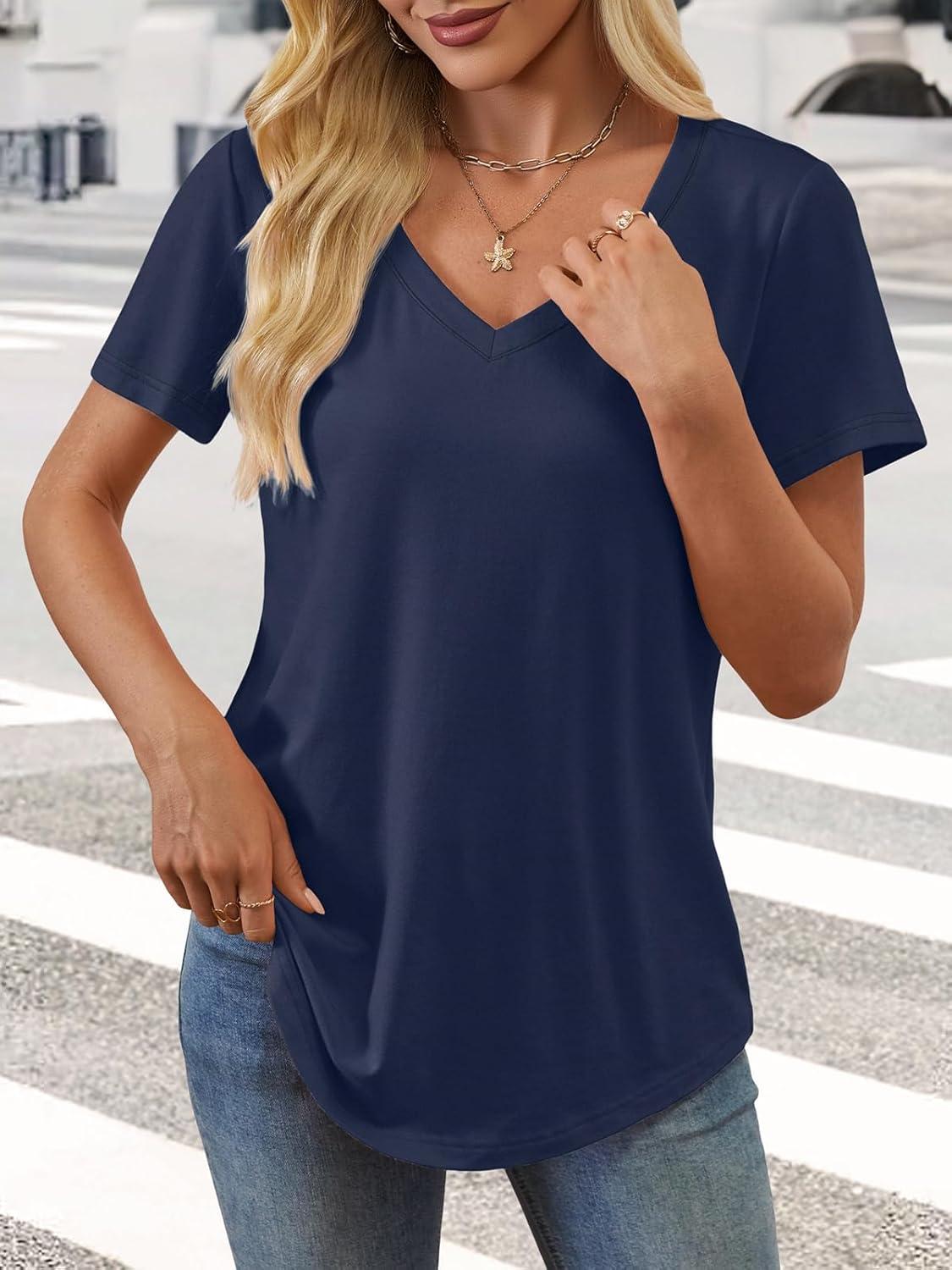 ATHMILE Womens V Neck Short Sleeve Summer T Shirts Curved Hem Plain Top Beach(Navy)