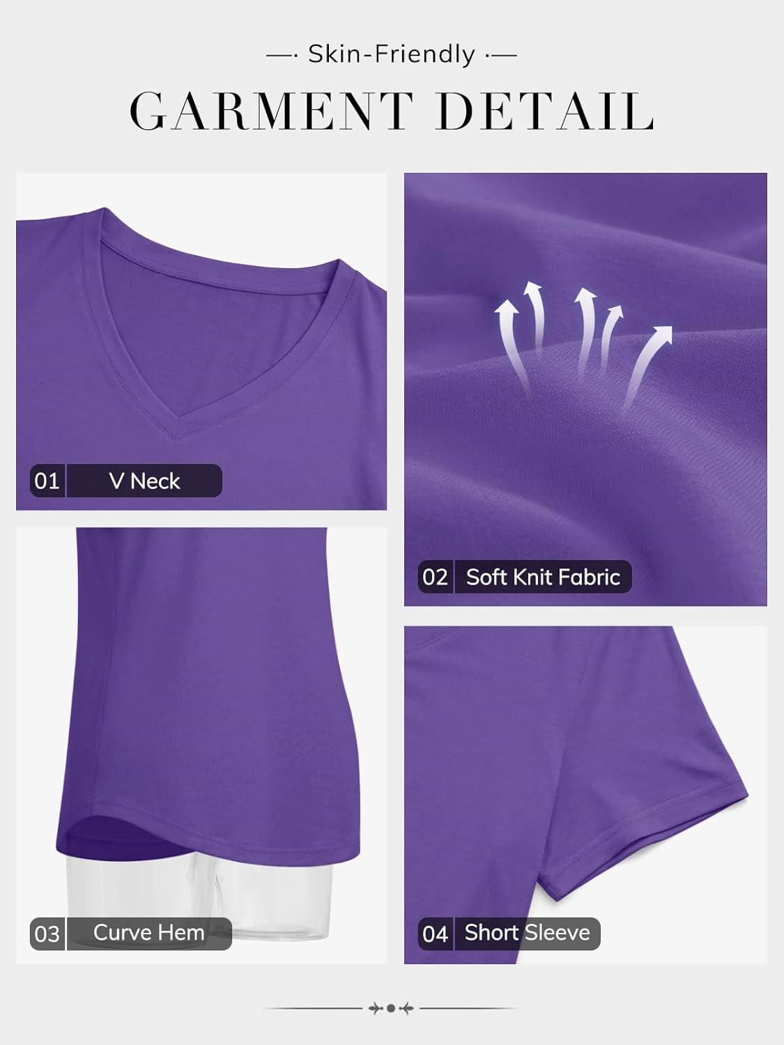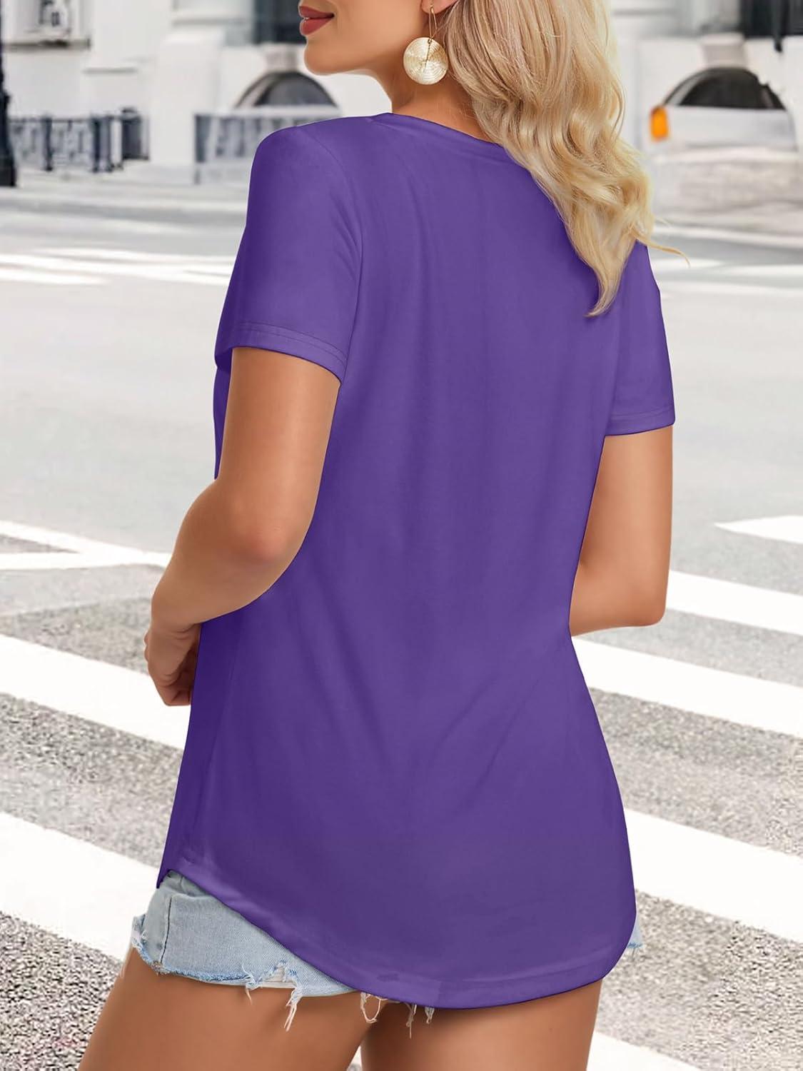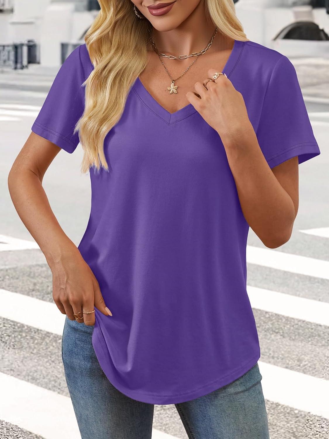 ATHMILE Womens V Neck Short Sleeve Summer T Shirts Curved Hem Plain Top Beach(Purple)